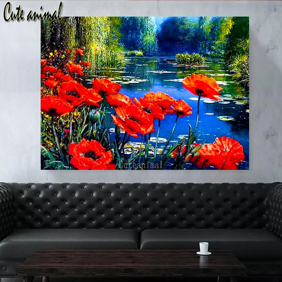 5D алмазная живопись, Маковое озеро, красный цветок, декорации, художественное украшение, вышивка крестиком, полная квадратная круглая дрель, алмазная вышивка, искусство