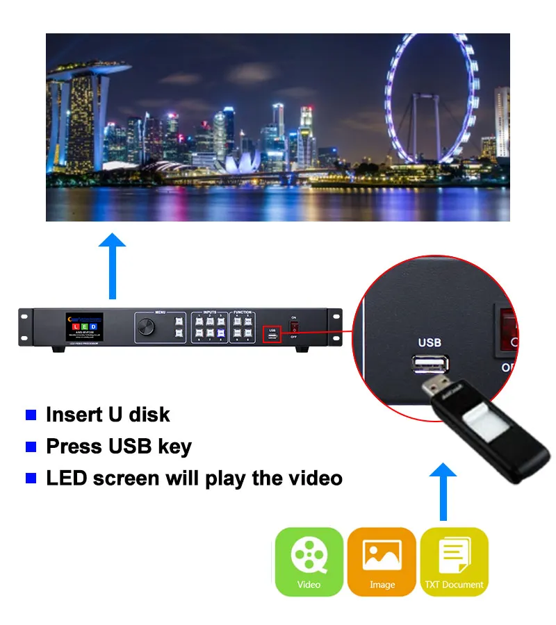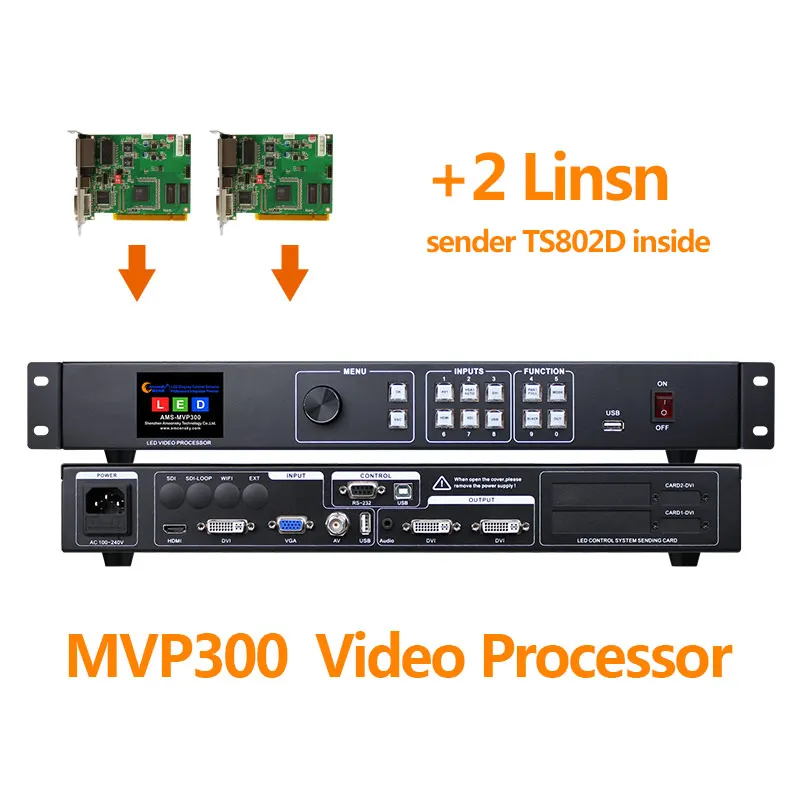 Несколько видео входов -- серия MVP300 использует 5 каналов видеовхода, включая 1 Композитный видео AV (CVBS), 1 канал VGA, 1 канал DVI, 1 канал HDMI, 1 канал USB. В основном, потребности для гражданского и промышленного использования были покрыты. Бесшовное переключение всех видео входов. Интерфейс видеовыхода -- серия MVP300 имеет 2 DVI видеовыхода, 2 видео запрограммированы на выход, светодиодный дисплей или карту отправки.