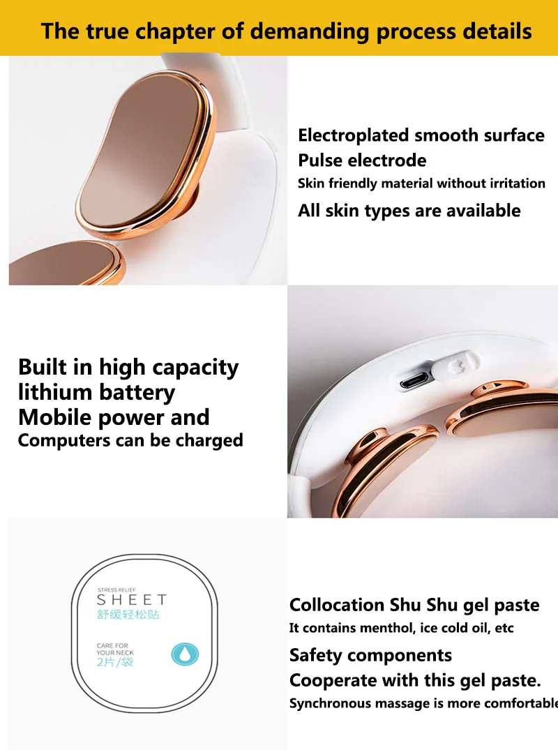 Меры предосторожности при использовании? 1) перед использованием инструмента намочите шею влажным полотенцем или тонером. 2) металлический патч должен быть близко к коже, чтобы избежать посторонних тел посередине. 3) впервые рекомендуется начинать с 1 до 9 класса. Для тех, кто любит высокую прочность, рекомендуется начинать с 10 передач. 4) рекомендуется использовать не более 15 минут. 5) не прикасайтесь к металлическому патчу руками. Принцип массажа? Низкочастотная импульсная технология Tens полезна для человеческого организма. Благодаря различной частоте тока Моделирование различных методов массажа человека, через металлическую пластину непосредственно на клетках мышц шеи, пробуждает жизненную силу клеток, способствует кровообращению, снимает мышечную усталость, углубляет эффект массажа. Почему вы чувствуете протекание при использовании массажного инструмента? Массажный инструмент имеет десятки принципов низкого электрического импульса, проходит через слабый ток для стимуляции болевых частей, для расслабления массажа, он похож на ощущение легкого поражения электрическим током, это нормальное явление, не протекает, можно использовать с легкостью. Почему вы не чувствуете массаж или не чувствуете себя неочевидным при использовании массажного инструмента? 1) перед использованием влажное полотенце/гель с алоэ следует использовать для влажной шеи. 2) находится ли электродная часть массажного инструмента близко к шее? Необходимо отрегулировать положение, чтобы оно было близко к коже. 3) Если силовой механизм равен 0, нажмите «+», чтобы увеличить интенсивность массажа