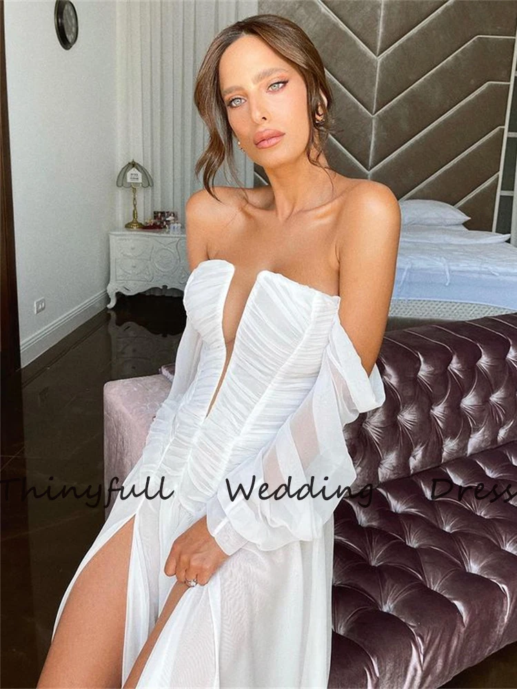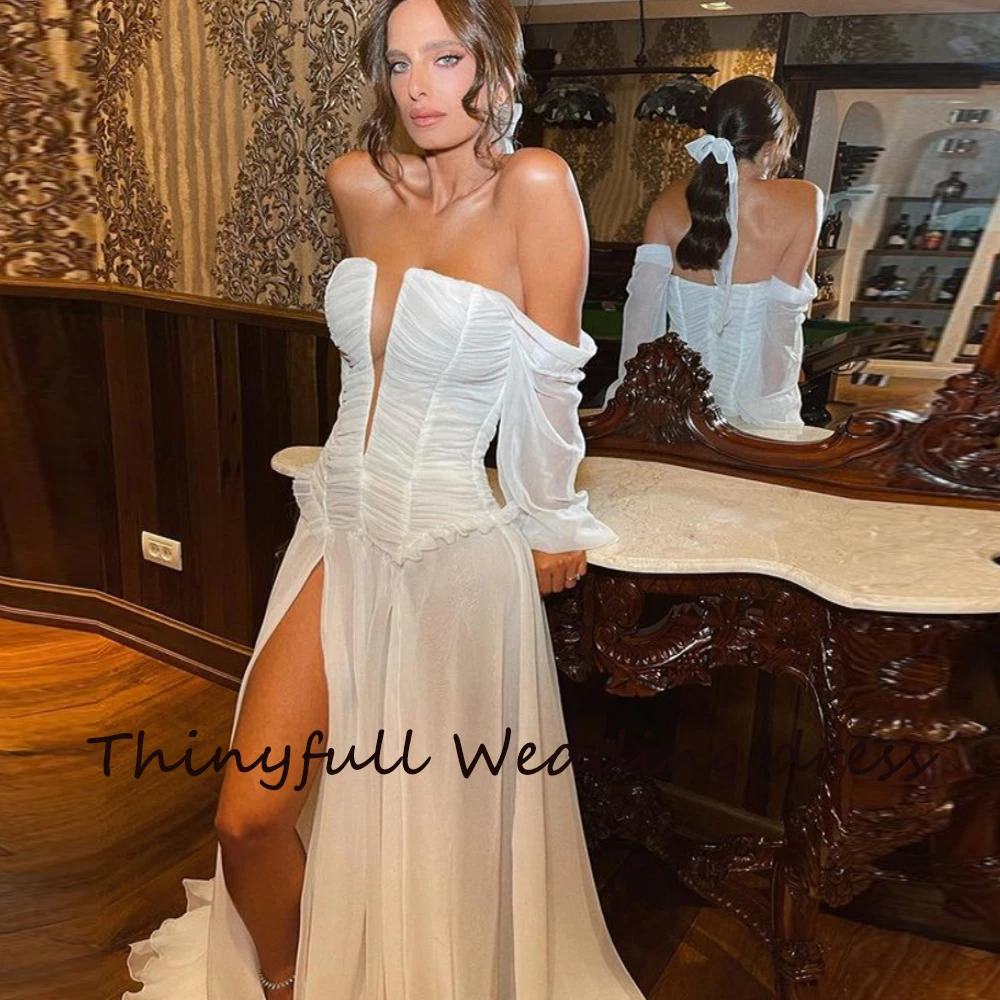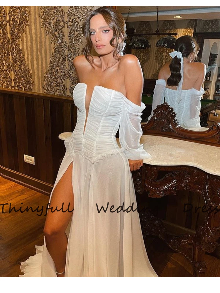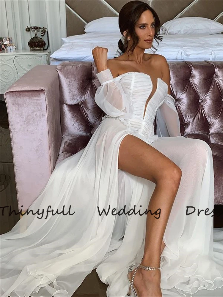 Свадебное платье в стиле бохо, скромное, с мягкими рукавами, с открытыми плечами, с высоким разрезом по бокам, Пляжное Платье, 2021