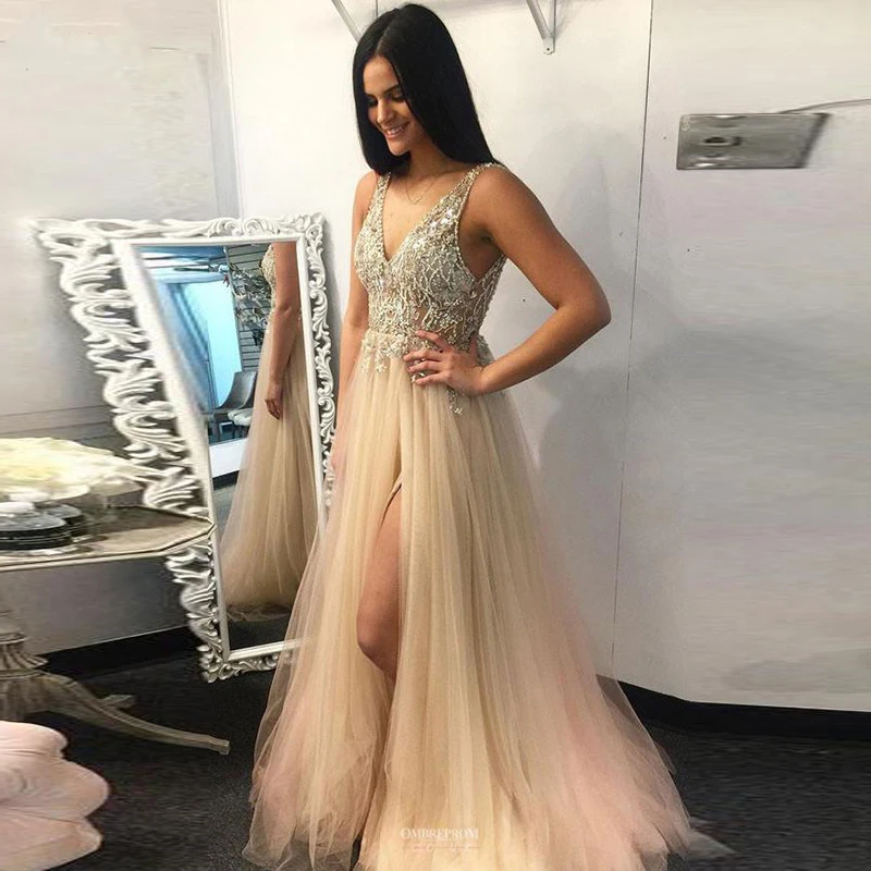 ANGELSBRIDEP, Длинные вечерние платья с V-образным вырезом, детские платья, сексуальные платья с разрезом сбоку, бисером, тюлевые платья Золушки для выпускного вечера