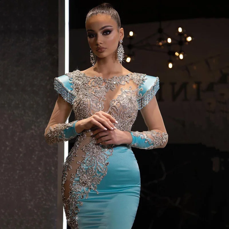 Светильник-голубое вышитое бисером платье русалки для выпускного вечера расшитый блестками с длинными рукавом атласные вечерние платья вырезом