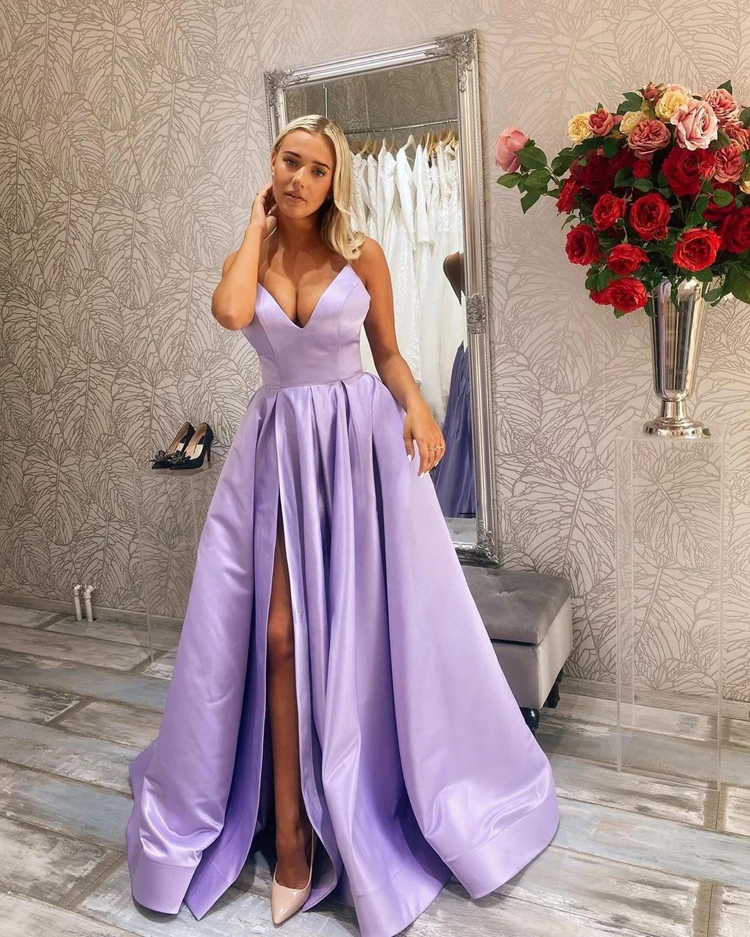 HONGFUYU сиреневые длинные платья для выпускного вечера с разрезом Атласное Вечернее официальное платье трапециевидные вечерние платья платье