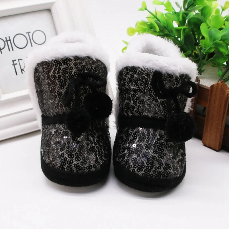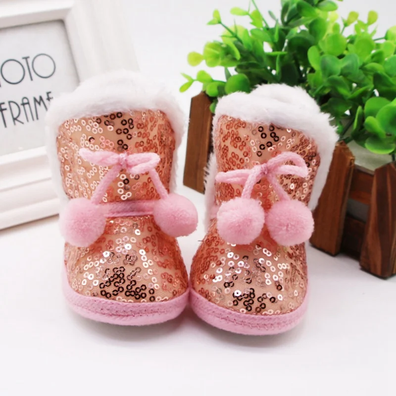 Детская нескользящая обувь для новорожденных, зимние ботинки с блестками для мальчиков и девочек, хлопковая обувь с плюшевыми помпонами