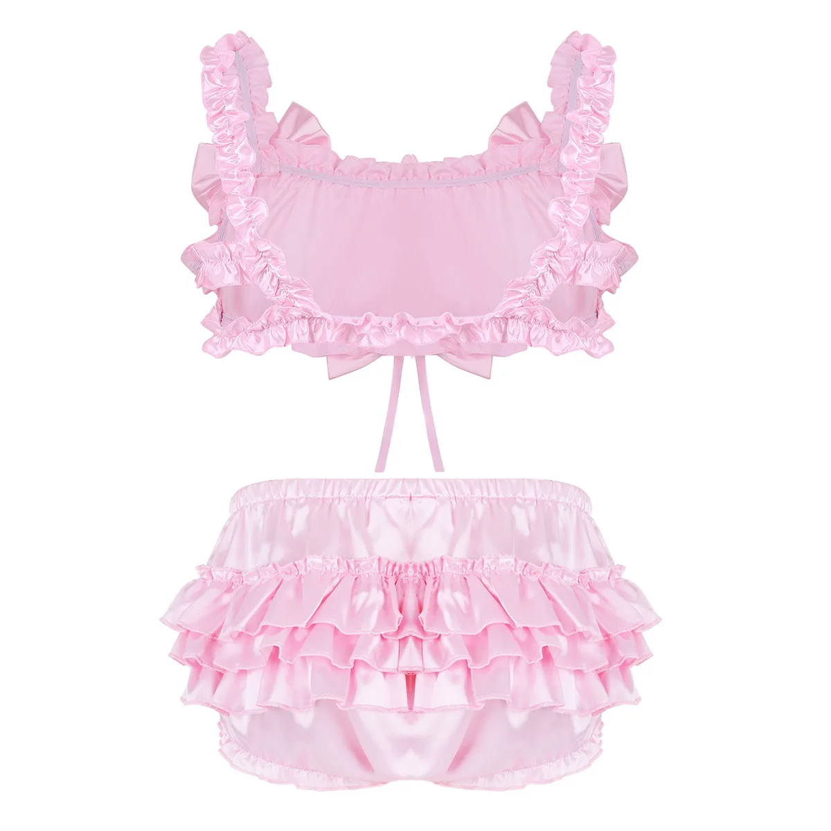 Мужской атласный комплект нижнего белья Sissy, бюстгальтер без косточек с рюшами и бантиком, укороченный топ, трусики-шаровары с многослойной юбкой, сексуальное мужское нижнее белье для геев