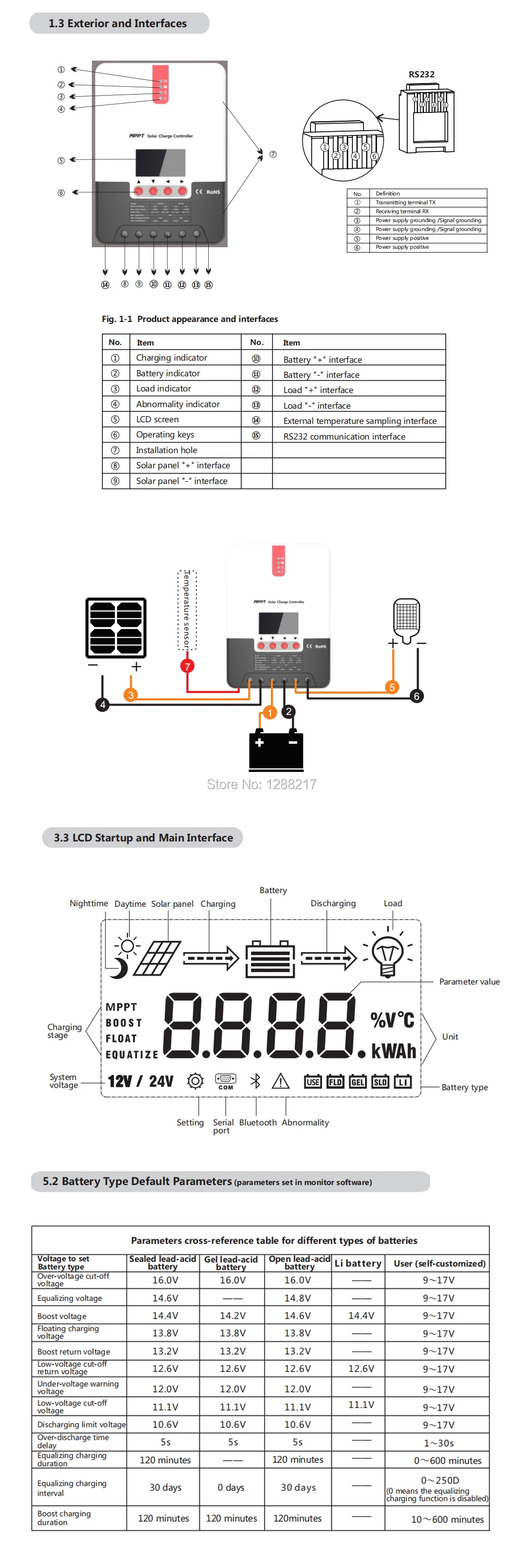 • С передовой технологией двойного пикового или многопикового отслеживания, когда солнечная панель затенена или часть панели выходит из строя, что приводит к нескольким пикам на кривой I-V, контроллер все еще способен точно отслеживать максимальную точку питания.• Встроенный алгоритм отслеживания точки максимальной мощности может значительно повысить эффективность использования энергии фотоэлектрических систем и повысить эффективность зарядки на 15% до 20% по сравнению с обычным методом PWM.• Сочетание нескольких алгоритмов отслеживания позволяет точно отслеживать оптимальную рабочую точку на кривой I-V за очень короткое время.• Продукт имеет оптимальную эффективность отслеживания MPPT до 99.9%.• Передовые технологии цифрового источника питания повышают эффективность конверсии энергии до 98%.•Доступны варианты программы зарядки для различных типов батарей, включая гелевые батареи, герметичные аккумуляторы, открытые батареи, литиевые батареи и т. д. • Контроллер оснащен ограниченным режимом зарядки. Когда мощность солнечной панели превышает определенный уровень, а зарядный ток больше номинального тока, контроллер автоматически снизит мощность зарядки и доведет зарядный ток до номинального уровня.• Поддерживается мгновенный Запуск большого тока емкостных нагрузок.• Поддерживается автоматическое распознавание напряжения батареи.• Светодиодный индикатор неисправности и ЖК-экран, которые могут отображать информацию о ненормальности, помогают пользователям быстро идентифицировать неисправности системы.• Доступна функция хранения данных в истории, и данные могут храниться до года.• Контроллер оснащен ЖК-экраном, с помощью которого пользователи могут не только проверять операционные данные и состояние устройства, но и изменять параметры контроллера.• Контроллер поддерживает стандартный протокол Modbus, удовлетворяя потребности в связи различных случаев.• Контроллер оснащен встроенным механизмом защиты от перегрева. Когда температура превышает установленное значение, ток зарядки будет снижаться линейной пропорции к температуре, чтобы обуздать повышение температуры контроллера, эффективно удерживая контроллер от повреждения от перегрева.• Благодаря функции компенсации температуры, контроллер может автоматически регулировать параметры зарядки и разрядки, чтобы продлить срок службы батареи.