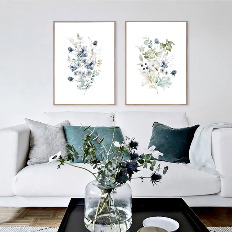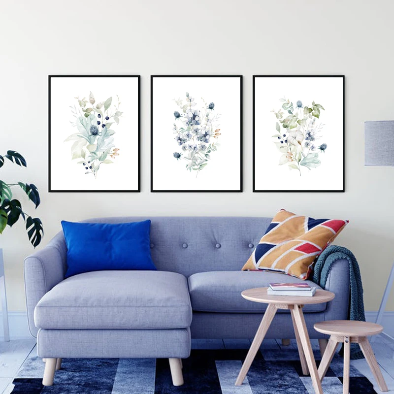 Картина с акварелью и синими цветами, постеры для украшения стен гостиной