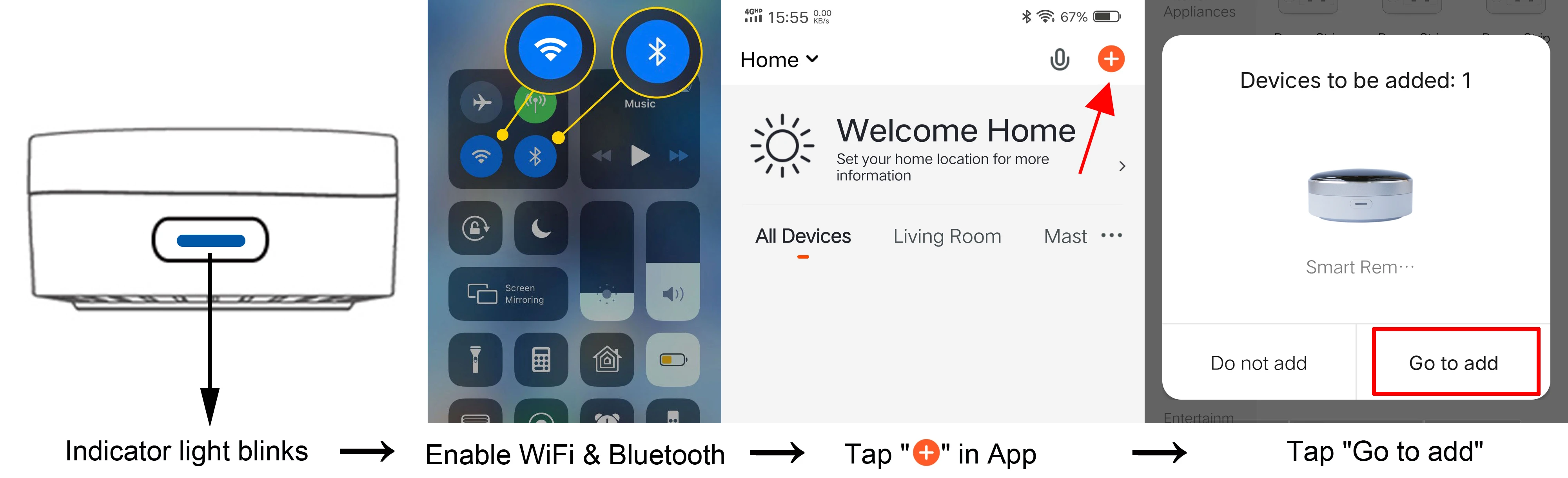 Включите телефон, Wi-Fi и Bluetooth, а также проследите за индикатор светильник-это быстро мигать, откройте приложение, нажмите «Добавить устройство» или «+», несколько секунд позже, приложение будет всплывающее окно, нажмите «перейти, чтобы добавить», чтобы добавить устройство. Затем выполните шаги в приложении.