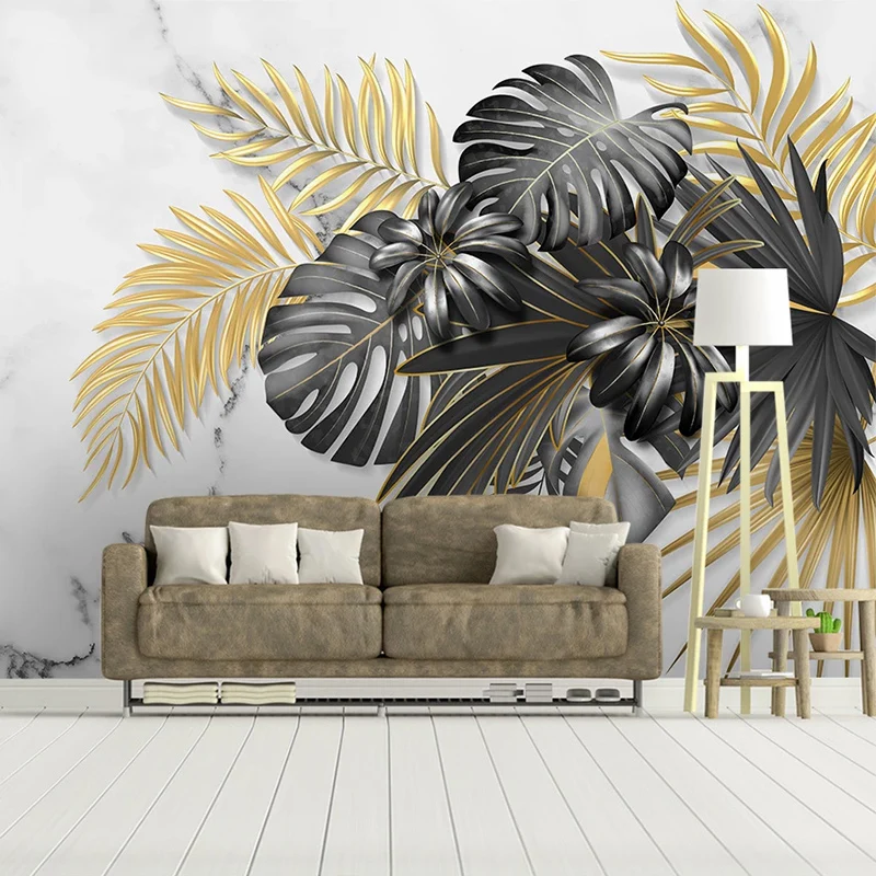 Фотообои 3D, ручная роспись, тропические растения, черные, золотые листья, фотообои для гостиной, телевизора, дивана, спальни