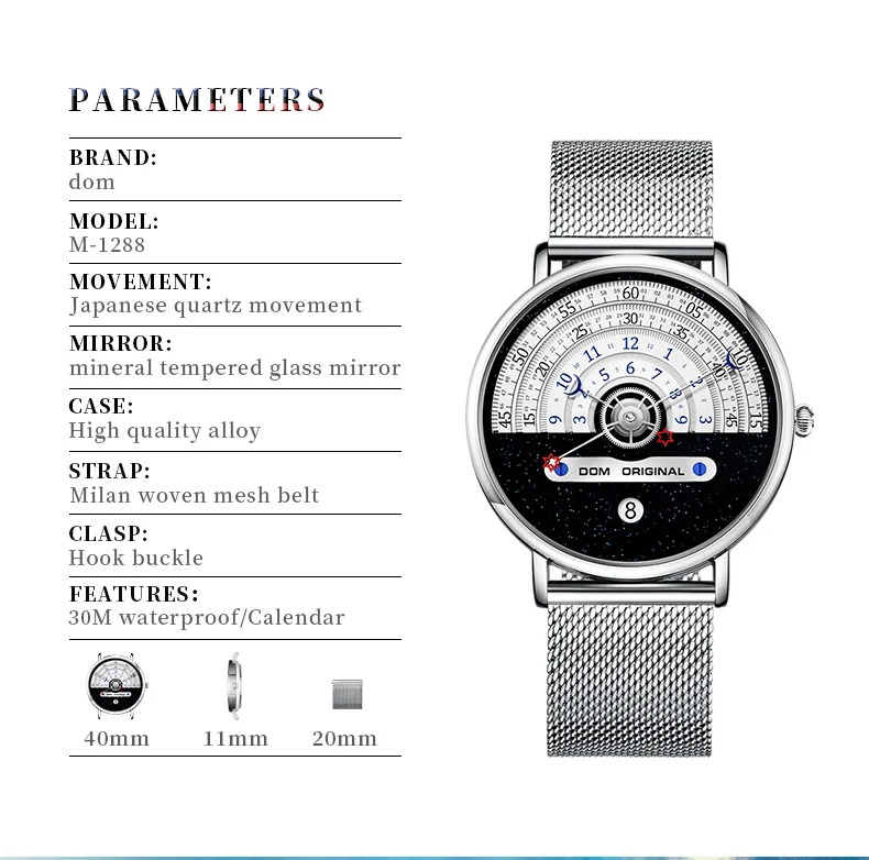 Бренд: DOM-Дисплей: аналоговые кварцевые часы-Стиль: Модный, Повседневный, роскошный, простой-Особенности: Водонепроницаемость Основная особенность:-100% новый с биркой и высоким качеством;-3 АТМ/30 М Водонепроницаемость (поддержка холодного душа и плавания, не использовать часы под водой, не поддерживать горячую воду);-Качественный чехол из цинкового сплава;-Качественный ремешок из нержавеющей стали; Спецификация приближения:-Чехол Диаметр: 4 см-Чехол Толщина: 1,15 см-Ширина ремешка: 2 см-Общая длина: 21,2 см Посылка включает в себя:-Часы DOM-1 шт.-1 x DOM Box