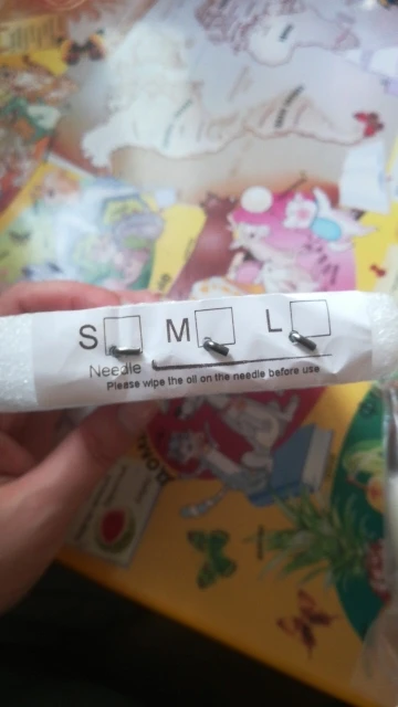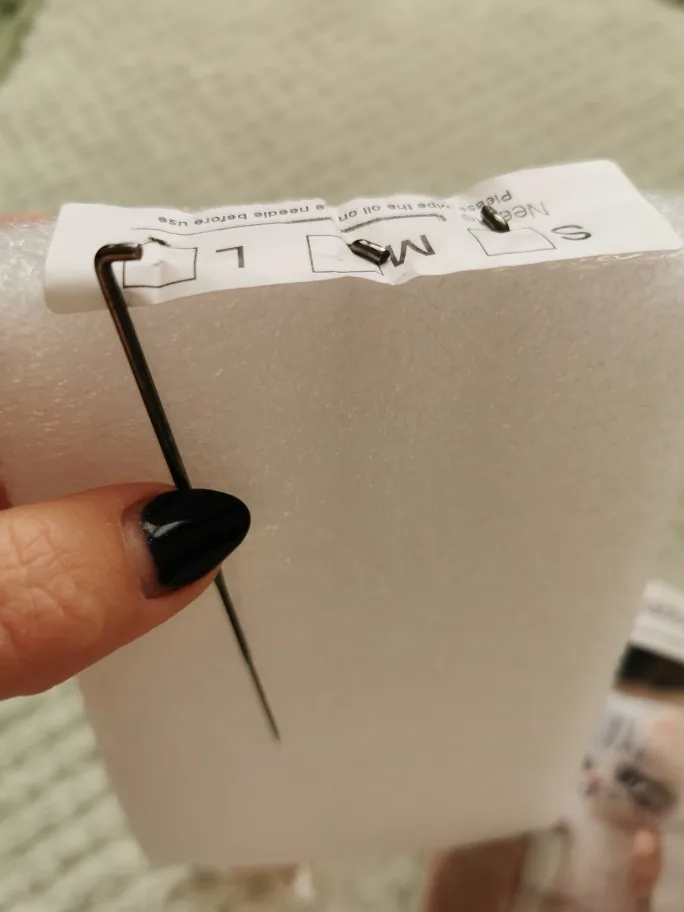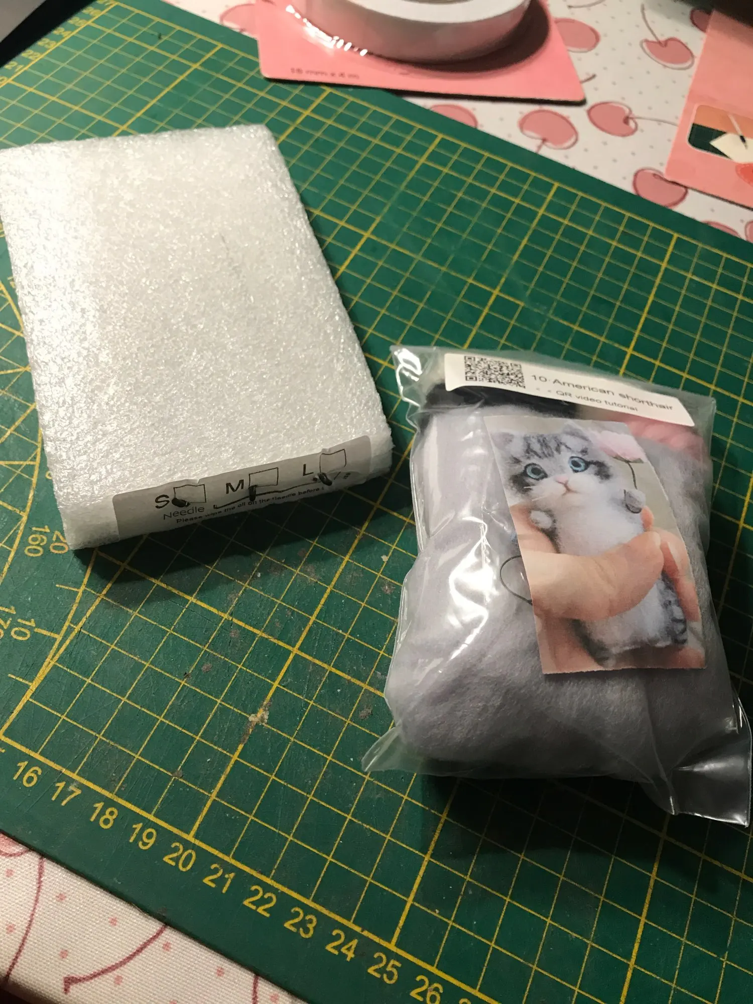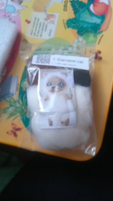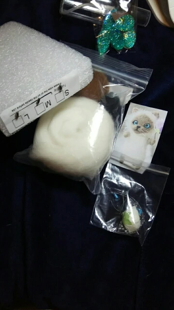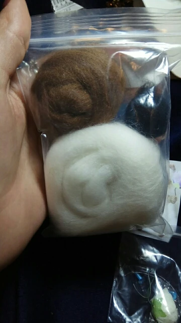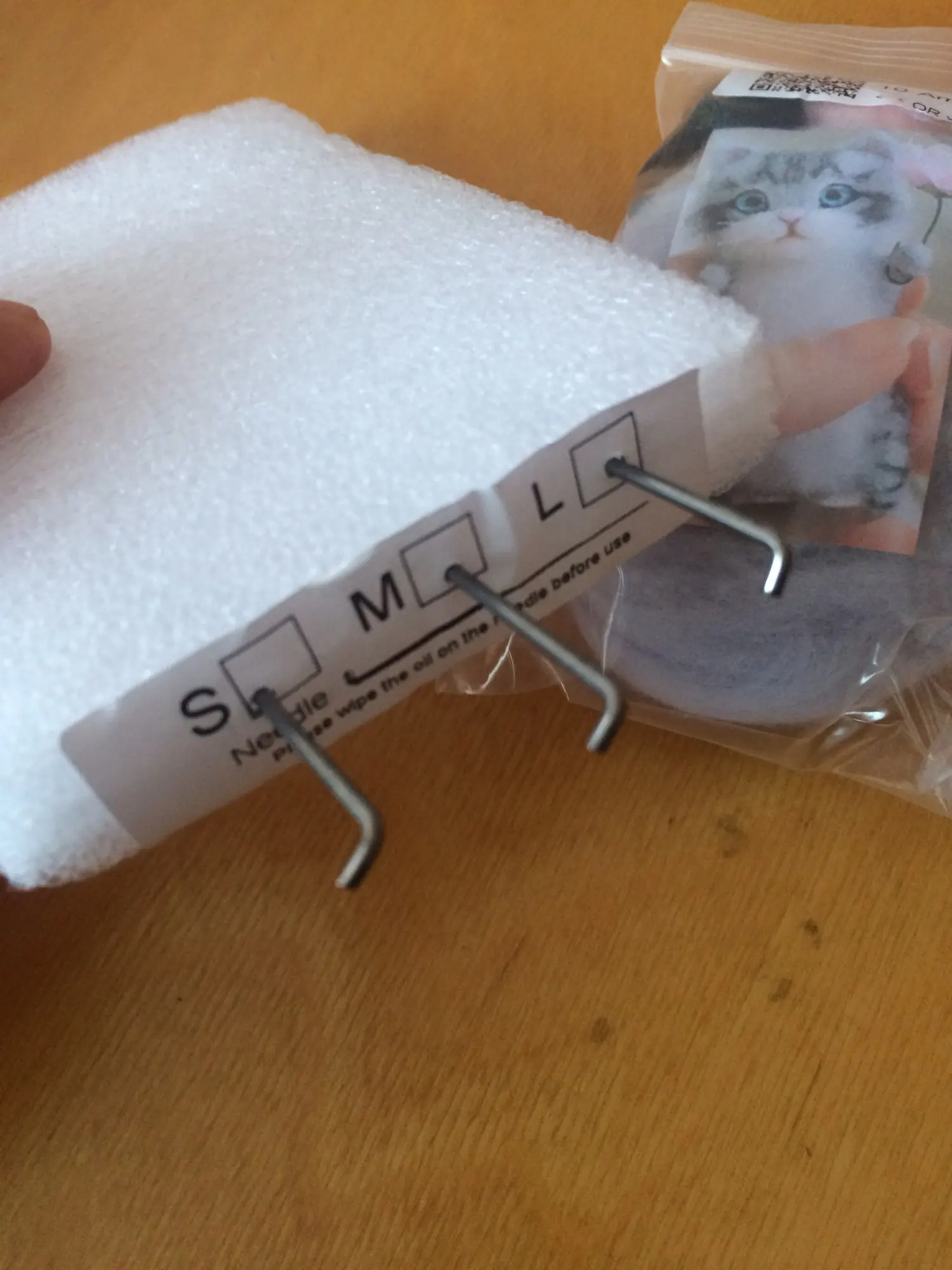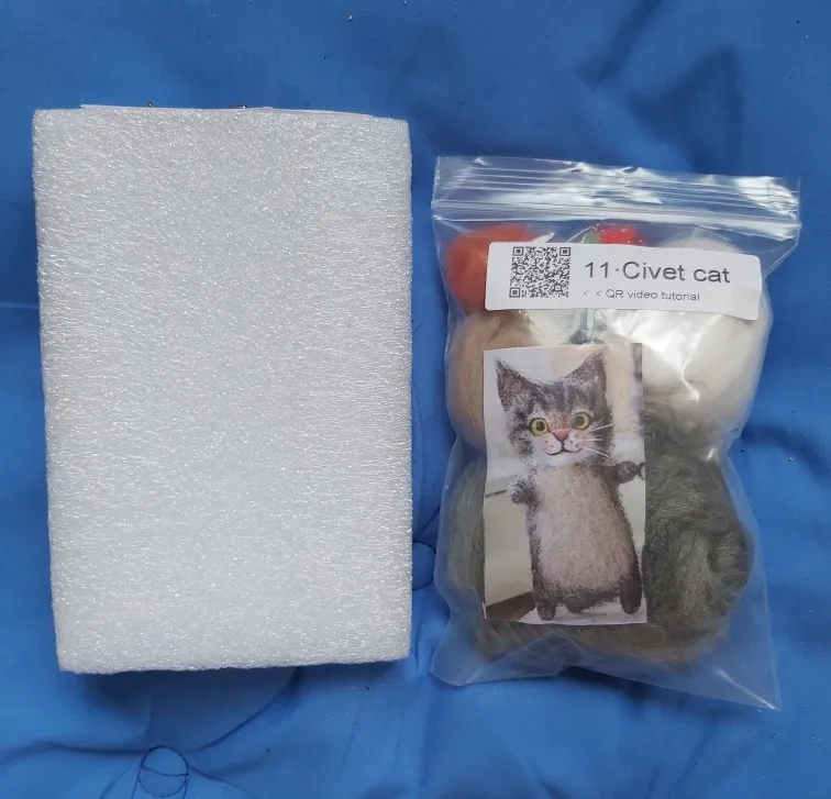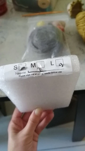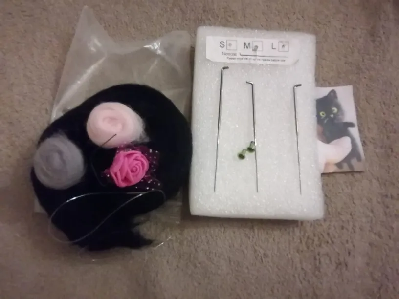 Посылка шла 1,5 месяца. В комплекте 3 иглы разных размеров, шерсть 3 цветов, подложка в которую вотнкнуты иглы, пара глаз зеленоватого цвета, розочка на стеблей, кусочек лески. В общем довольна, пока игрушку не делала, посмотрим, что получится)