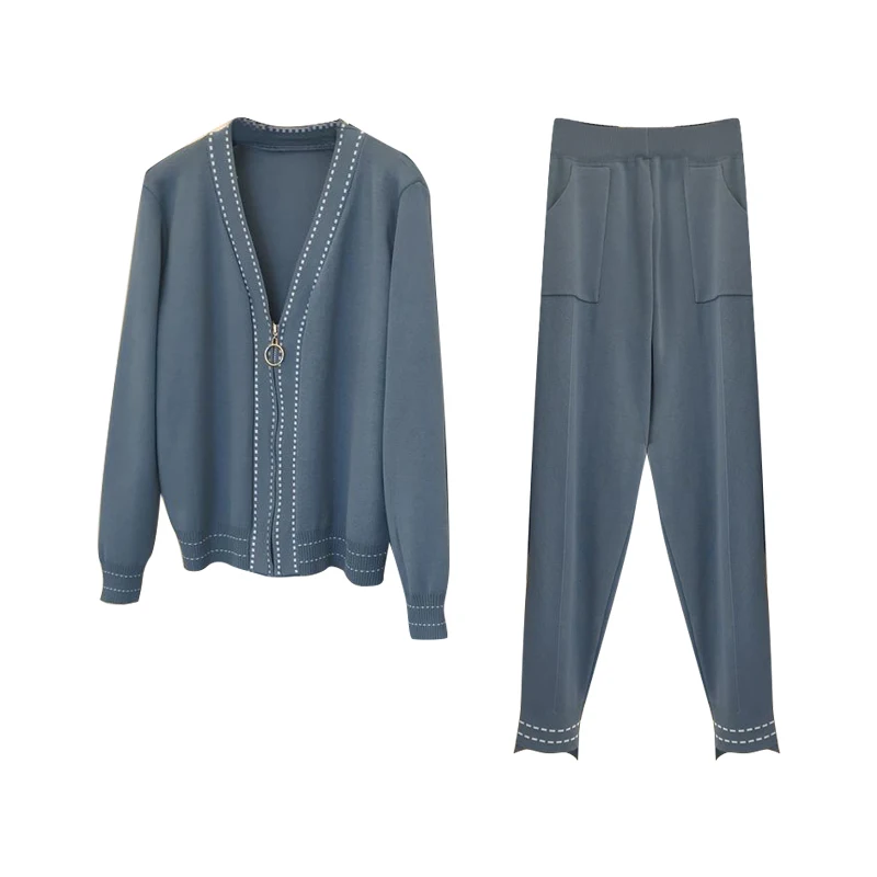 Женский вязаный комплект из 2 предметов, свитер на молнии с V-образным вырезом и узкие брюки, весна-осень
