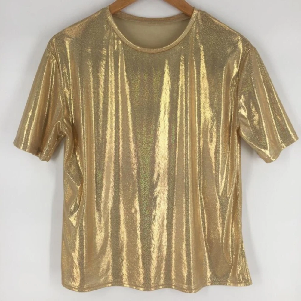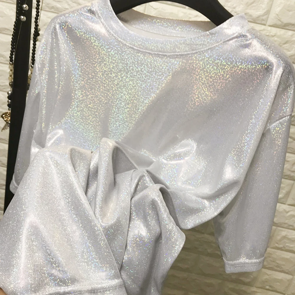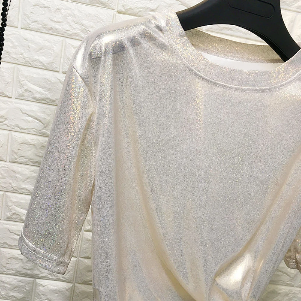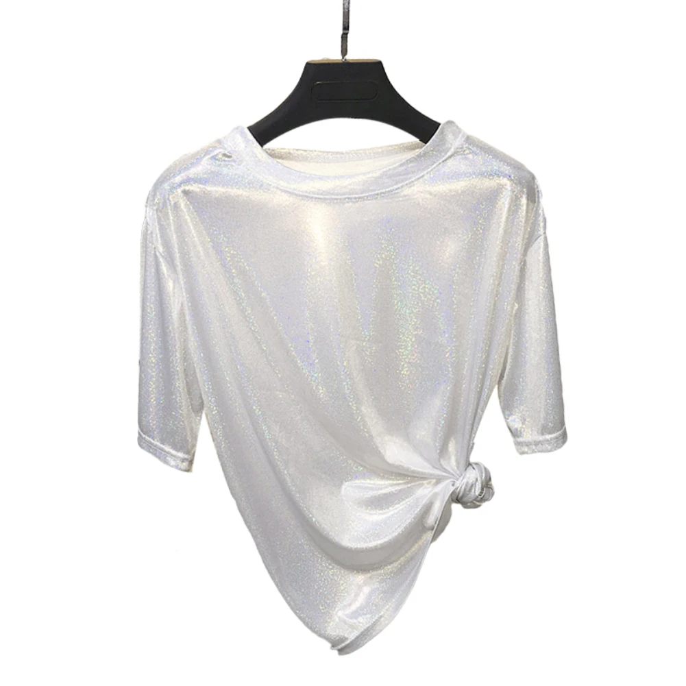 Женские повседневные однотонные Цвет с круглым вырезом с короткими рукавами блестящие со свободным низом футболки легко поймать несущественным образом отличаться