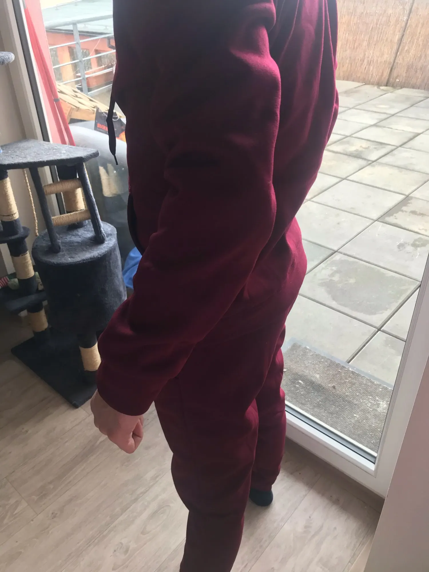 Красивый цвет, неприятная синтетическая ткать, склонная к катышкам и элекролизации. Толстовка широка в плечах и узка в бедрах(что не удивительно, костюм то мужской. На параметры 87/64/93 м села в облипку, не оверсайз