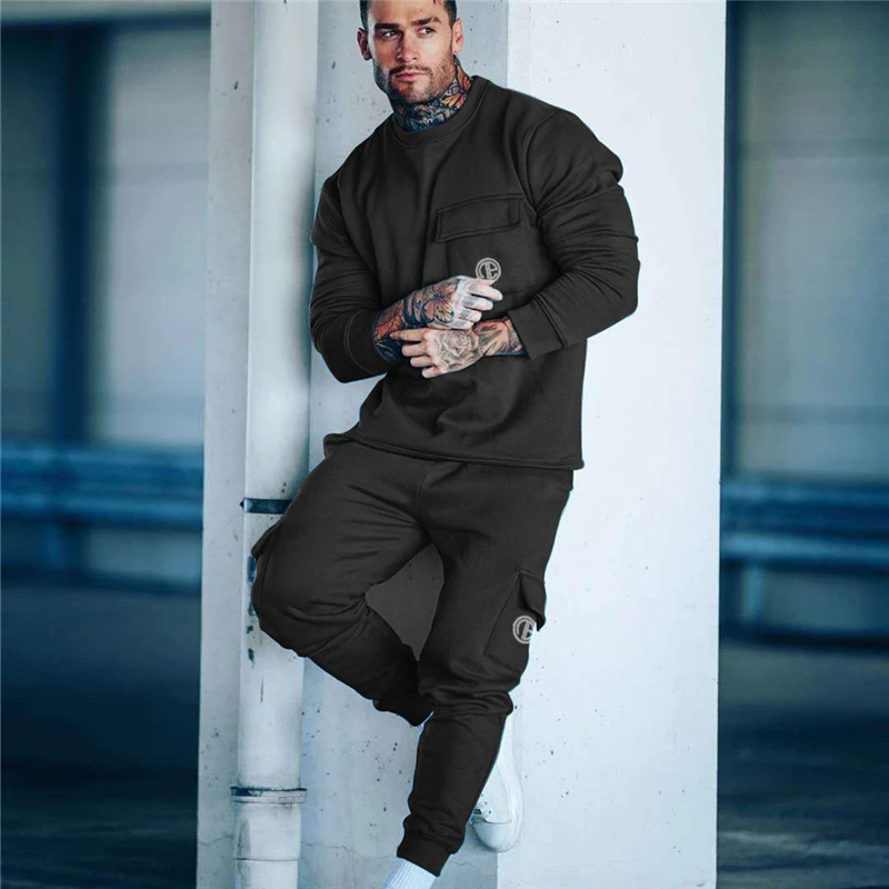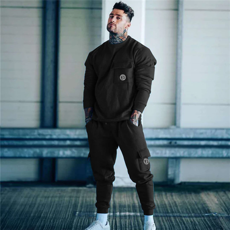 Спортивный мужской костюм для фитнеса, хлопковая рубашка с длинными рукавами и штаны для спортзала и бега, для осени и зимы