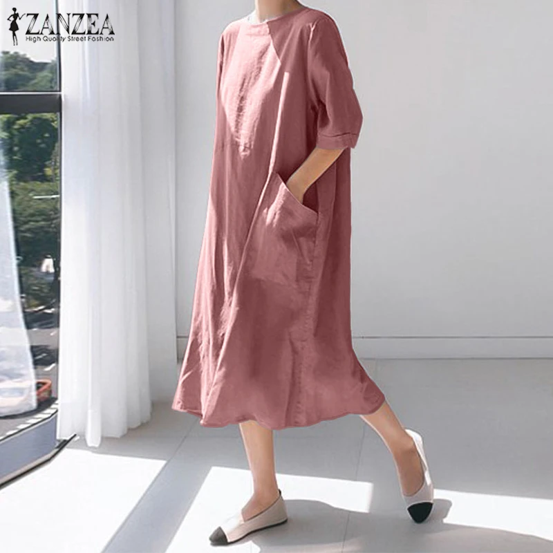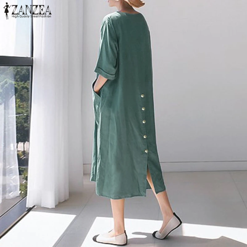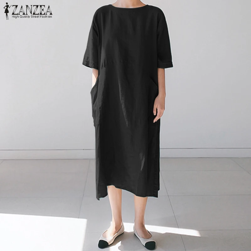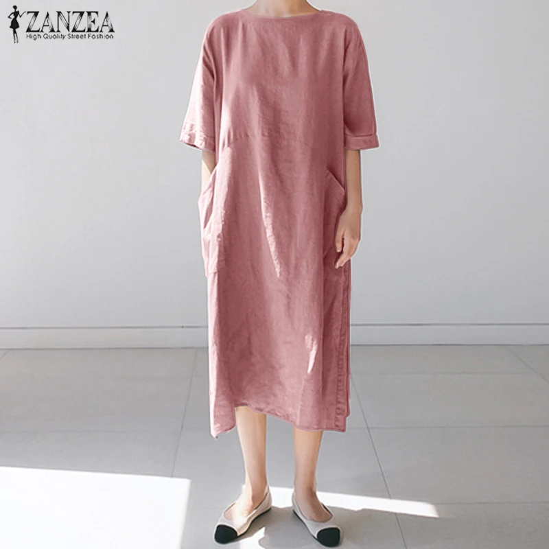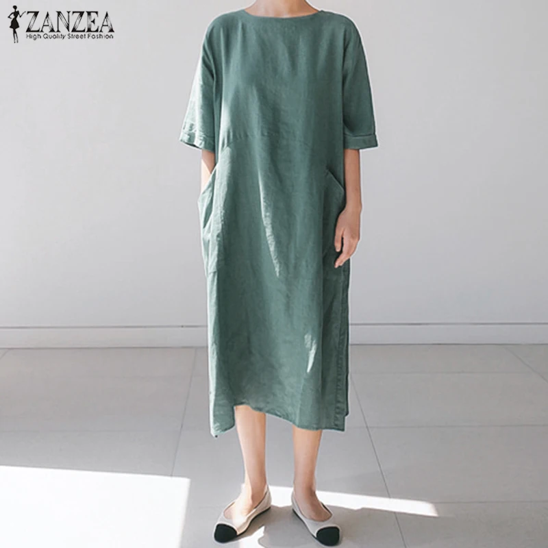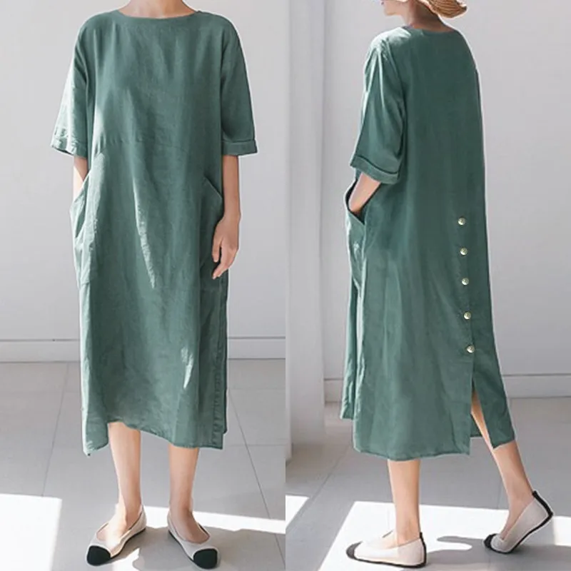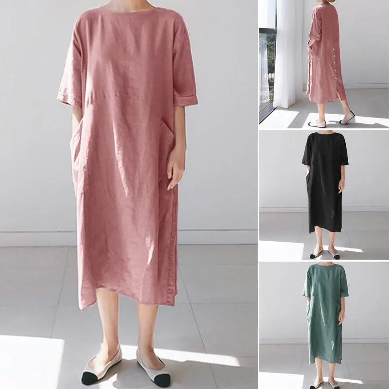 Посылка входит: 1 платьеМатериал: 100% хлопокЦвета: черный, зеленый, розовыйРазмер: S,M,L,XL,2XL,Длина рукава: рукав три четвертиВырез: круглый вырезУзор: однотонныйДлина: длина до середины икрыТолщина: тонкая, толстаяУкрашение: боковые карманыОсобенности: разрез по краюСтиль: Досуг, богемный, ретро, ЕвропаСезон: весна, лето, осеньПовод: семья вечерние, пляж, свадьба, праздник, работа