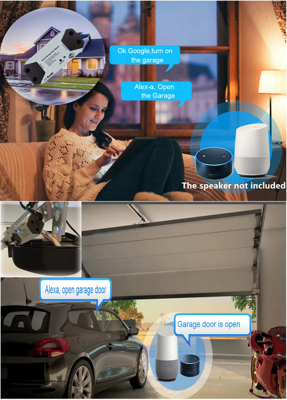 Вы должны добавить этот контроллер двери гаража для работы с приложением tuyasmart или smartlife и связать его с Amazon Alexa или Google Assistant для достижения голосового управления. У нас есть защита голосового кода, когда вы открываете дверь гаража.