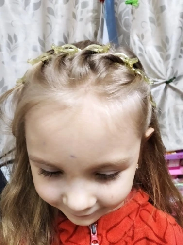 Ободок и заколка хорошего качества. Боялась что ободок окажется тугой и для ребёнка. Но нет, проходила целый день и почти не ощущала. Чтобы сделать такие красивые жгутики из волос и зацепить ободком надо конечно потренироваться, но выглядит классно Пришло за месяц, трек стал русским при пересечении таможни и по нему отслеживала.