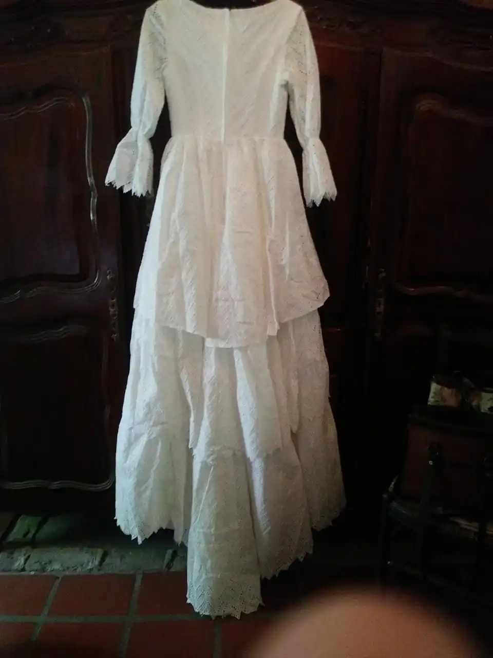 The dress fits perfectly to the measurements i made. The material is an eyelet lace, as seen in the review below. The dress has a lace up back instead of a zipper that adds a more formal feel, as requested. The person I spoke to about making the adjustments is very kind. I'm so pleased with this dress! I'll be getting alterations done to the neckline to make it a bit lower, and to change the elastic on the sleeves to white pearl buttons. But for the price of this dress - I would say it's a wonderful value! I'm pretty sure that reviewer that supplied the pictures of this dress is trying to sell the dress they ordered on here for 3x as much on their etsy shop - claiming it as their own work. The exact same pictures are on their etsy listing - but I could be wrong. Go through Verngo wedding dresses store instead!