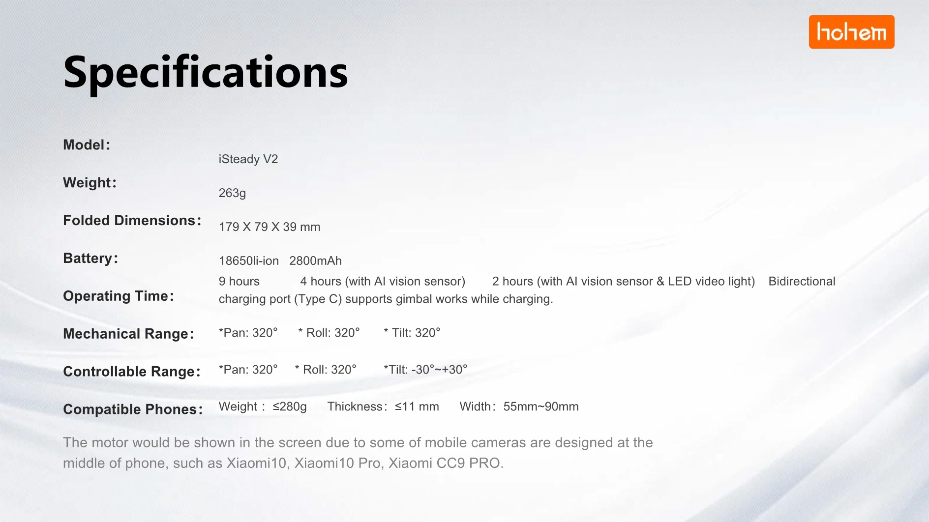 1. 259 259g Ультра-светильник дизайн: размеры в сложенном виде 179X79X39 мм, hohem iSteady X2 как смартфон, который портативный, чтобы положить его в карман или сумку и удобно носить с собой.