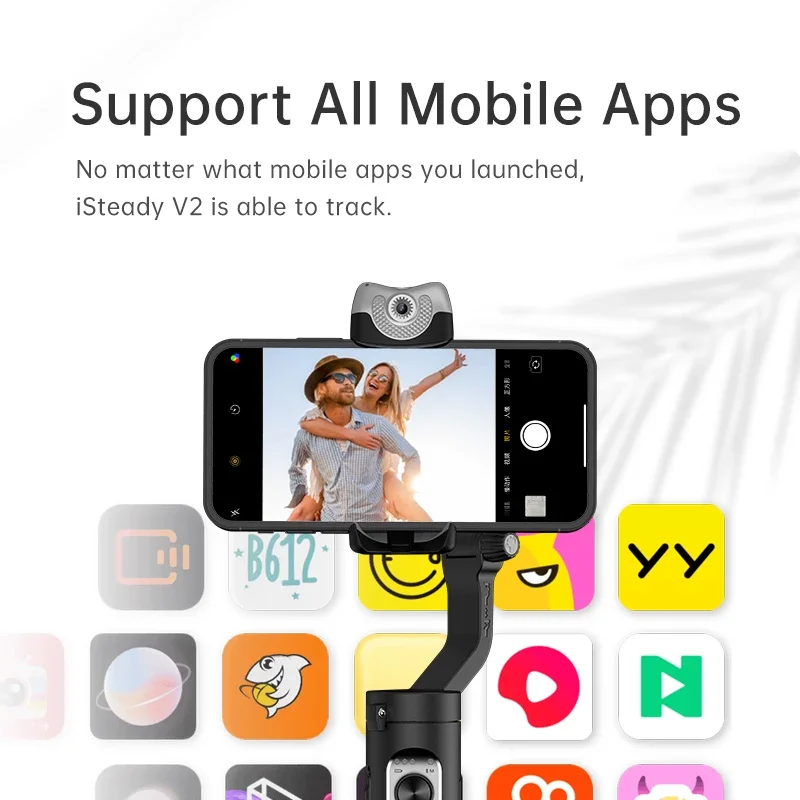 8.【Native Camera & Beauty Cam Support】: iSteady X2 Поддерживает собственные камеры и приложения beauty cam. Просто подключите через Bluetooth на вашем устройстве, легко снимайте фото и видео, нажав на затвор.