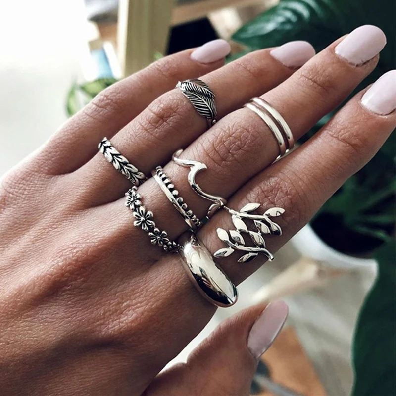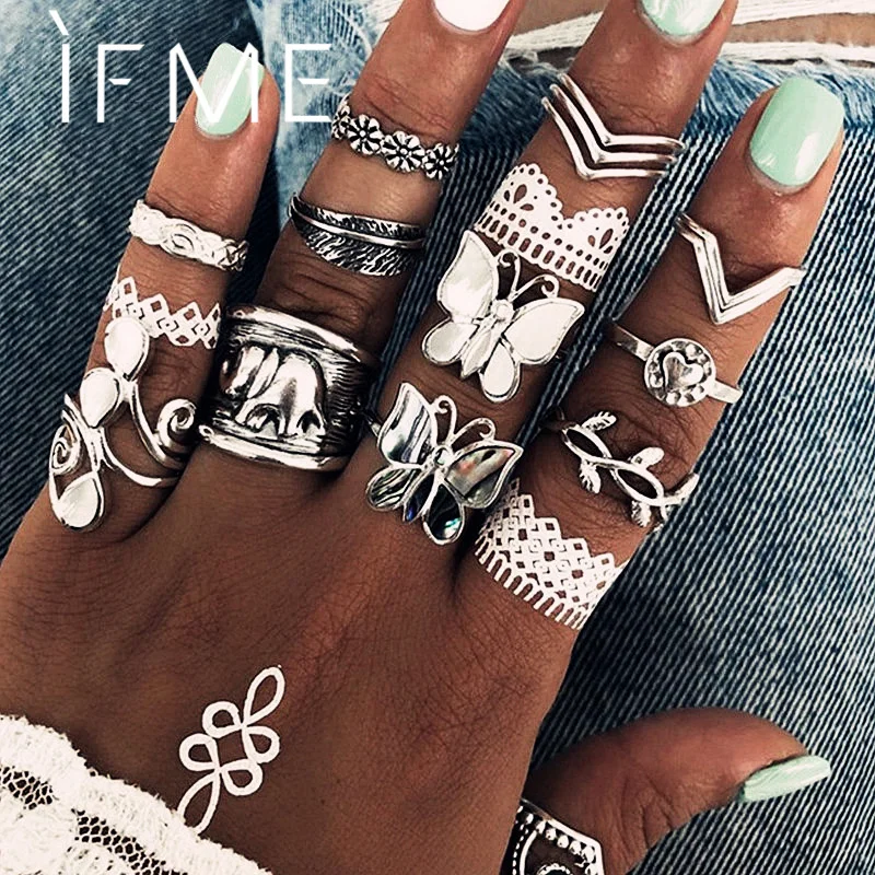 Набор Колец IF ME в богемном стиле для женщин, винтажные кольца серебристого цвета с геометрическим дизайном, слон, лист, кольцо на фаланг пальца, Подарочная бижутерия
