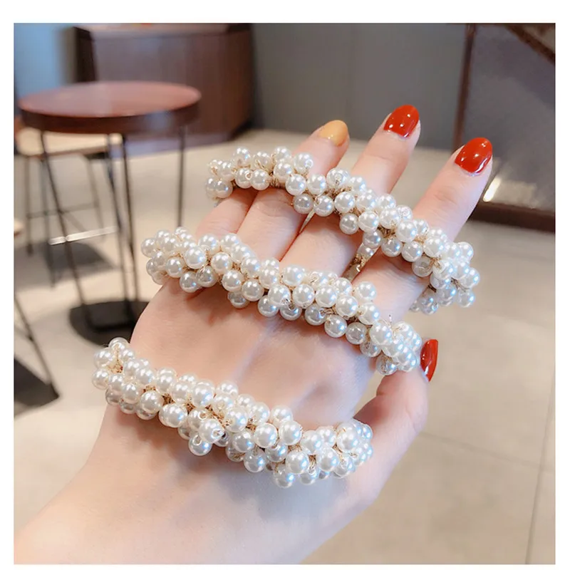 Резинка для волос с имитацией жемчуга для девочек, Женская повязка на голову, заколка для конского хвоста, белая, розовая, черная эластичная лента для волос с бусинами