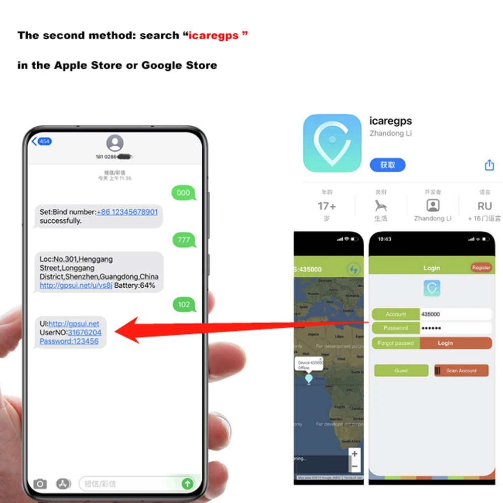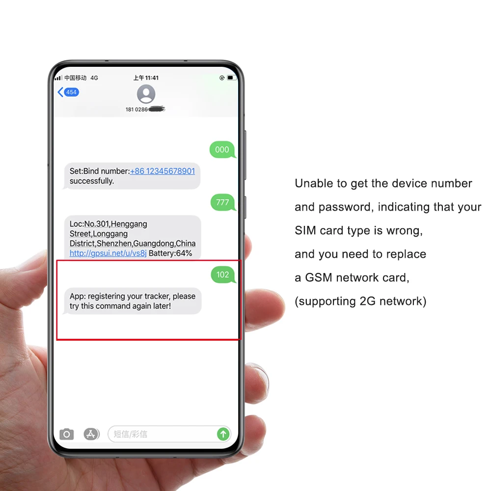 4. Отправьте SMS «102» на SIM-карту, чтобы получить номер устройства и парольЕсли GPS ответПолучить сообщениеПриложение: регистрируя ваш трекер, попробуйте эту команду еще раз позже!