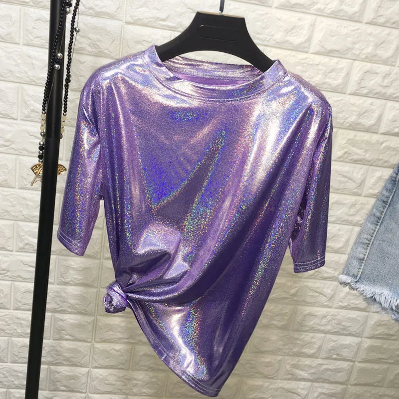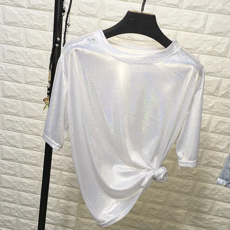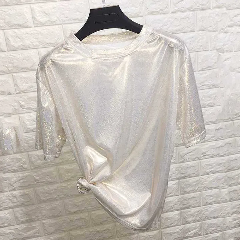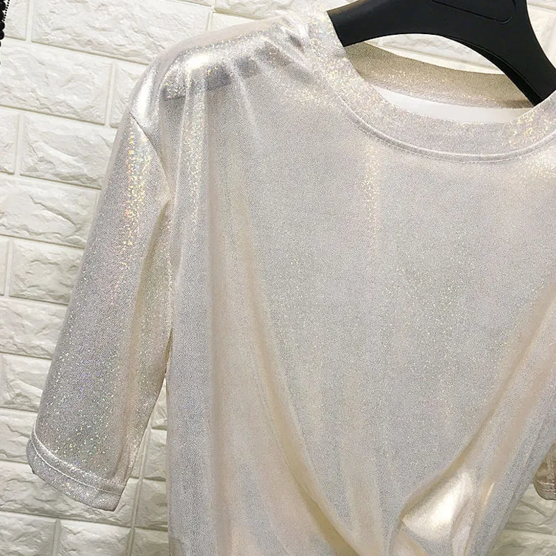 Женская Блестящая футболка с коротким рукавом и круглым вырезом, ле...