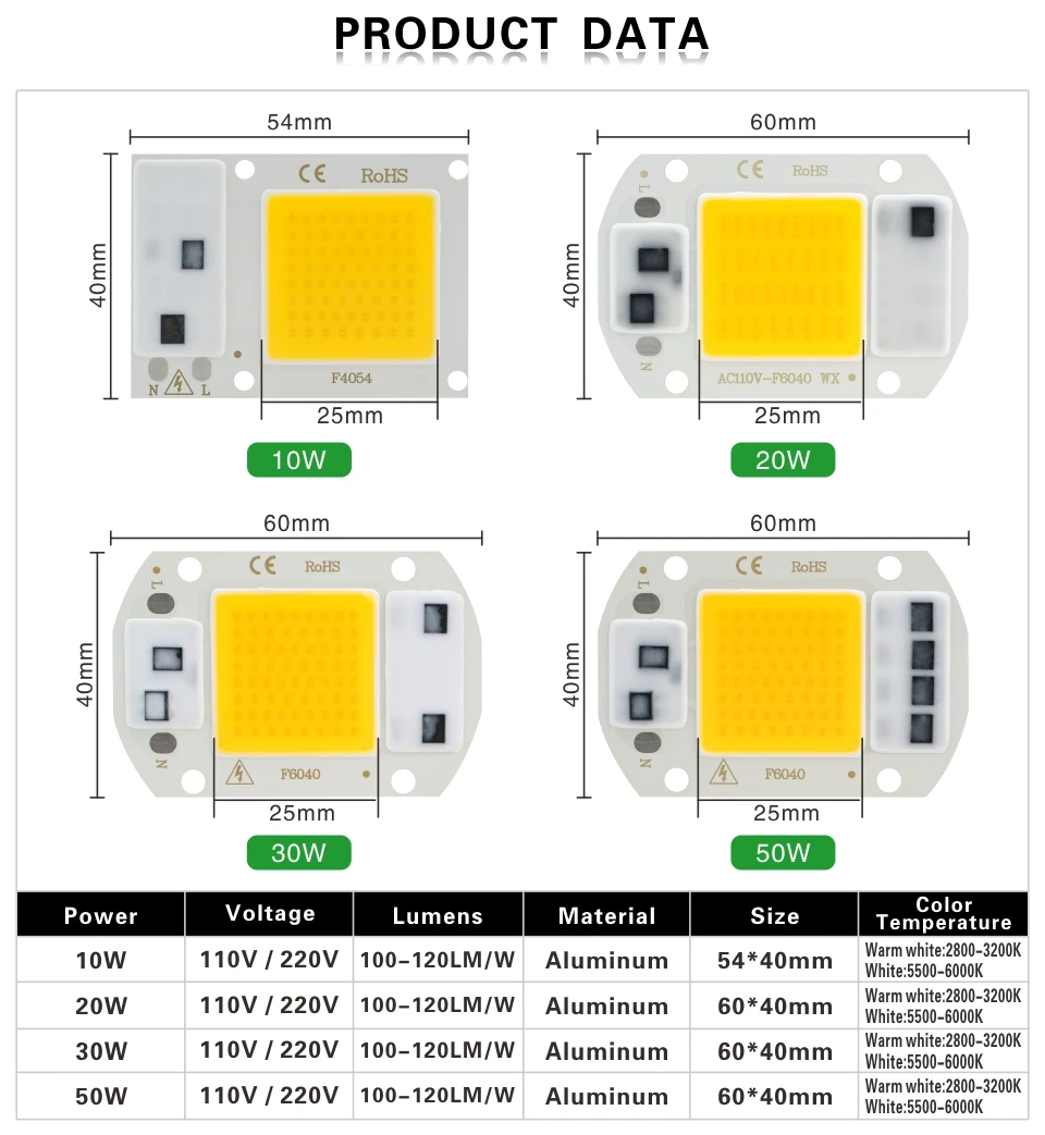 Чип светодиодный COB, не требует драйвера, 10 шт., 110 В, 220 В, 10 Вт, 20 Вт, 30 Вт, 50 Вт