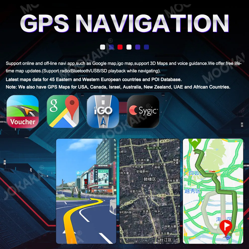 Поддержка онлайн и автономных приложений navi, таких как карта Google, карта igo, поддержка 3D карт и голосовое руководство. Мы предлагаем бесплатное обновление карты времени жизни. Воспроизведение радио/Bluetooth/USB/SD во время навигации. Последние карты данных для 45 стран восточной и европейской Европы и базы данных Pol Примечание: У нас также есть GPS карты для США, Канады, Израиля, Австралии, Новой Зеландии, ОАЭ и африканских стран.
