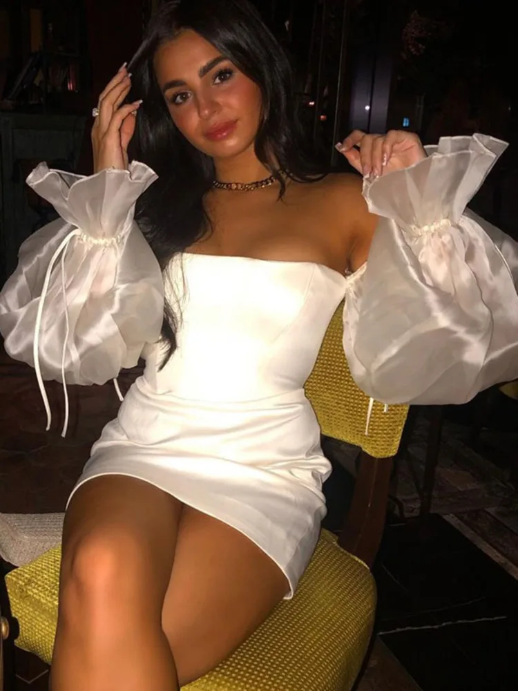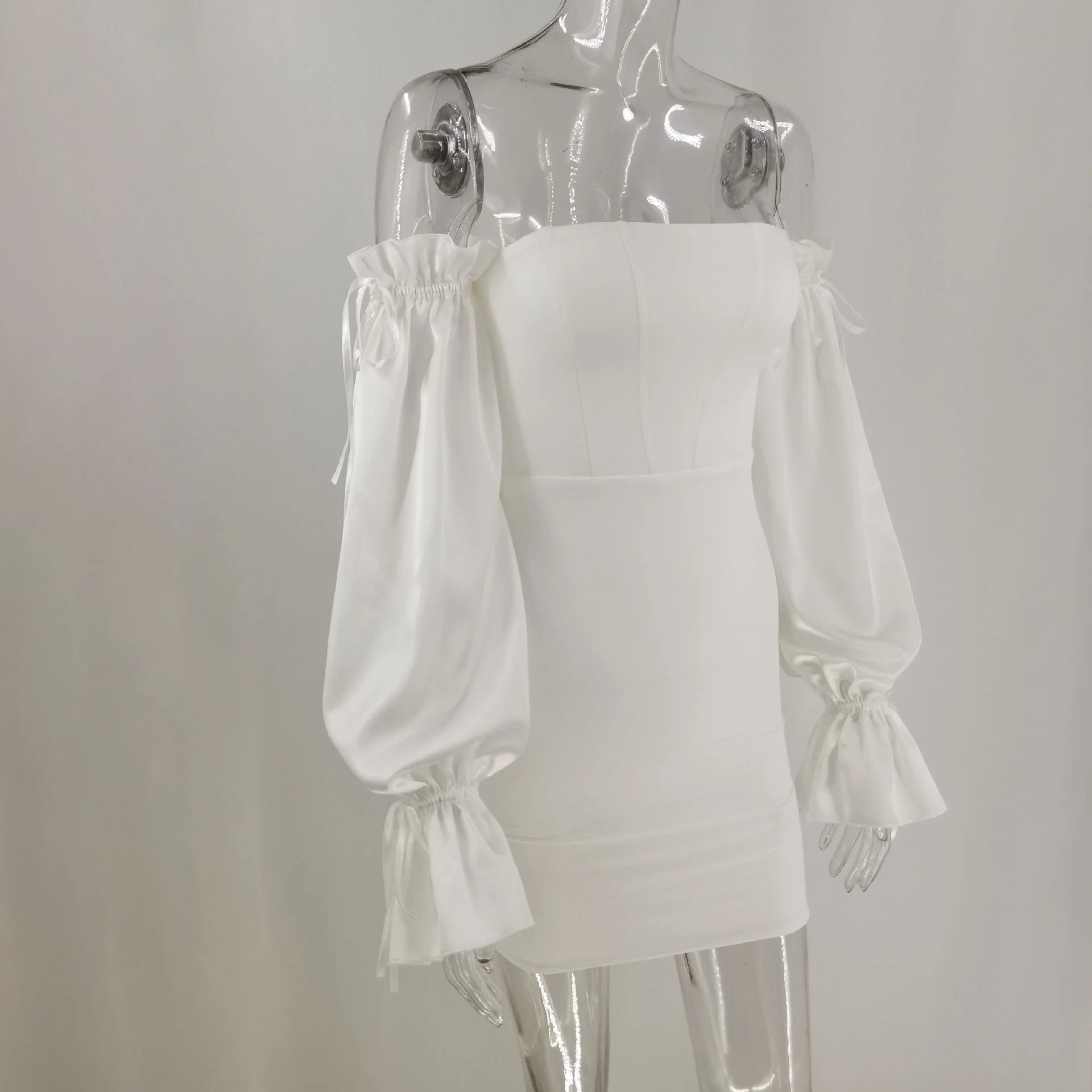 Женское вечервечерние мини-платье SRUBY, Белое Облегающее платье с открытыми плечами, длинными рукавами-фонариками и открытой спиной, лето, 2020