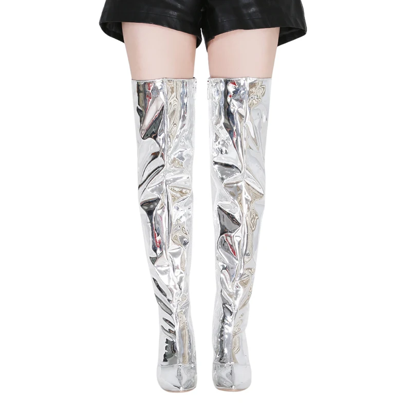 Женские привлекательные Серебристые высокие сапоги до бедра с острым носком, Клубная обувь для вечеринки, высокие сапоги выше колена на тонком высоком каблуке для женщин
