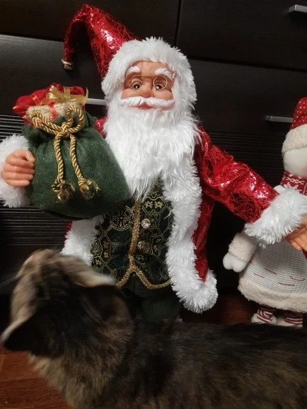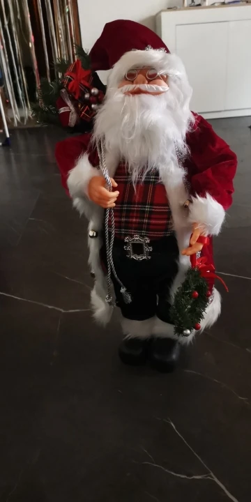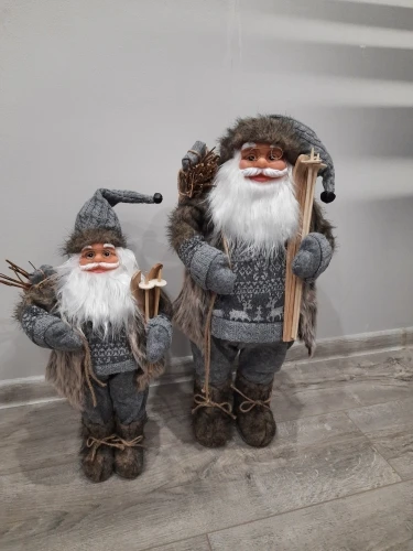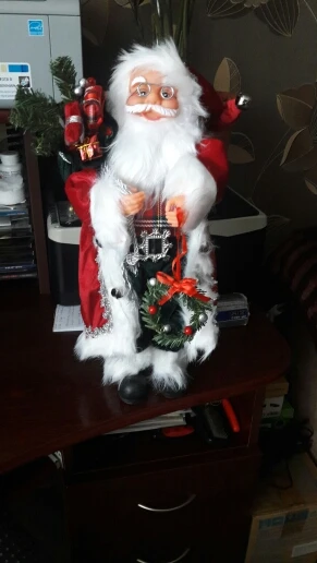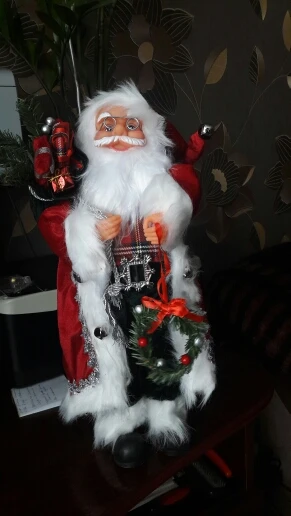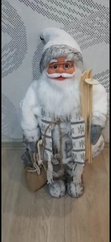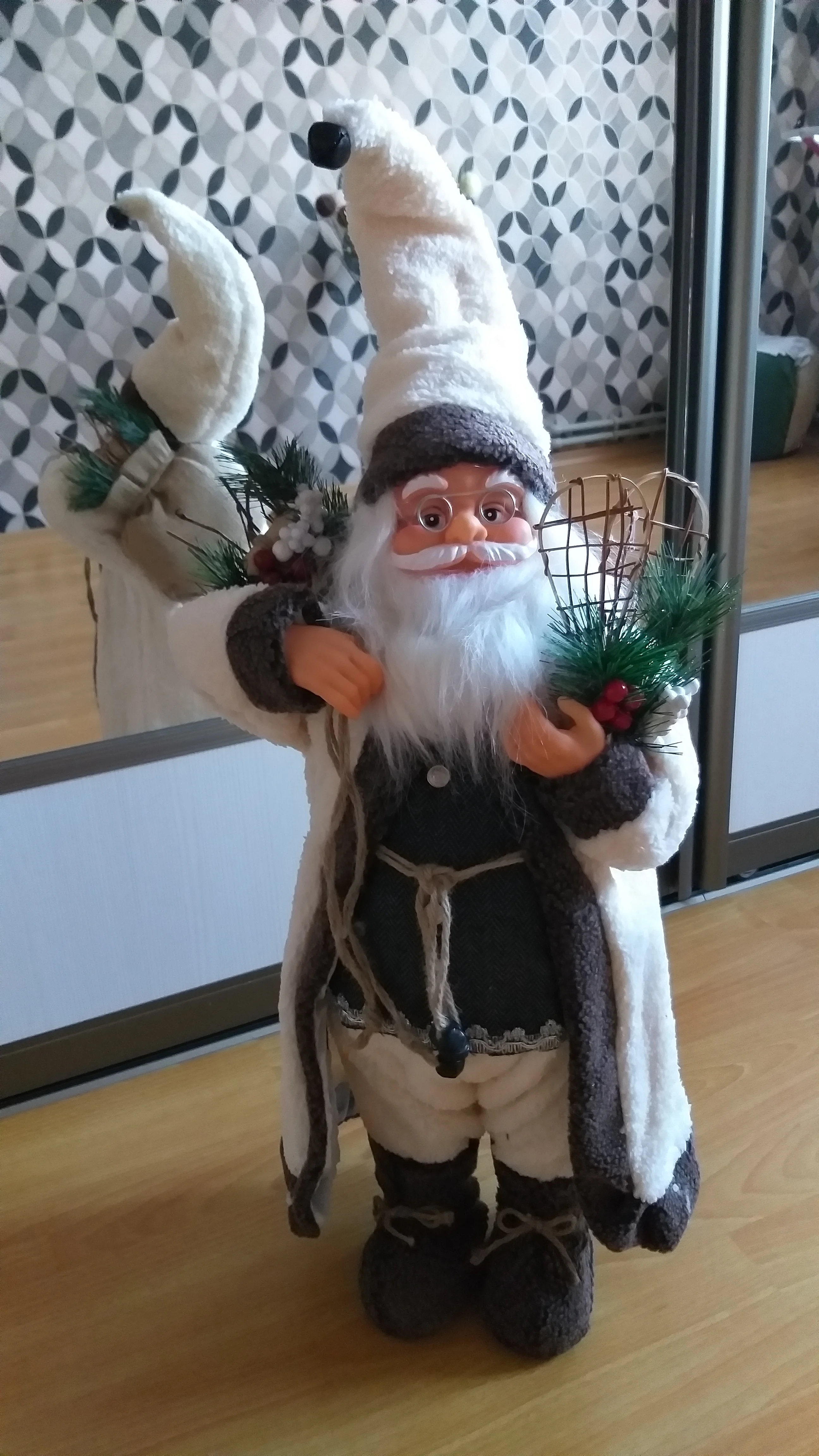 Отличный Дед Мороз, единственный минус, плохая упаковка из- за чего пластиковый живот частично помялся, но за свободным свитером это не видно. Из мешка с подарком убрала деревянные ветки. На фото кажется маленьким, но в жизни он огромный. Заказом довольна. Брала 60см