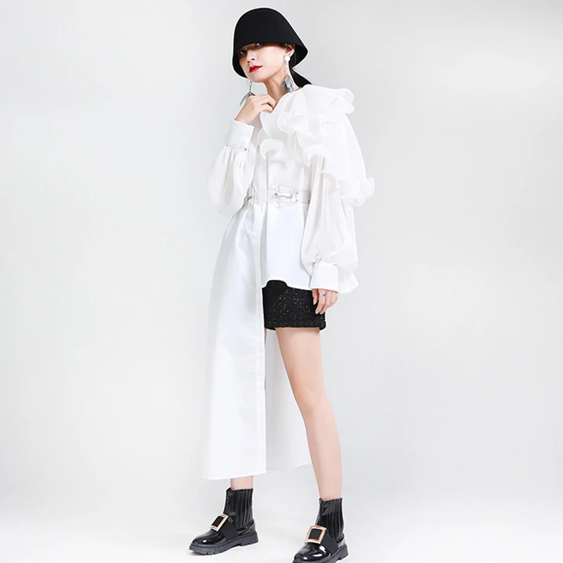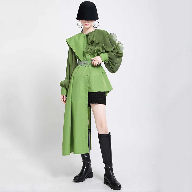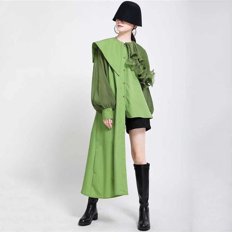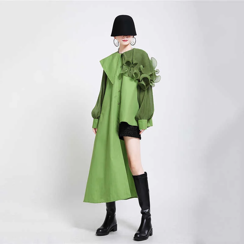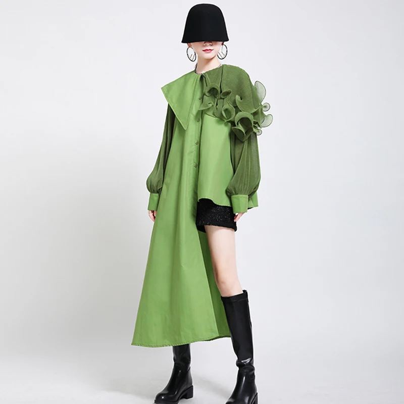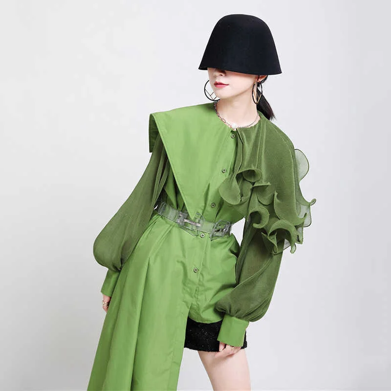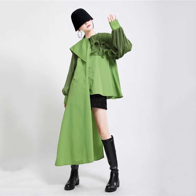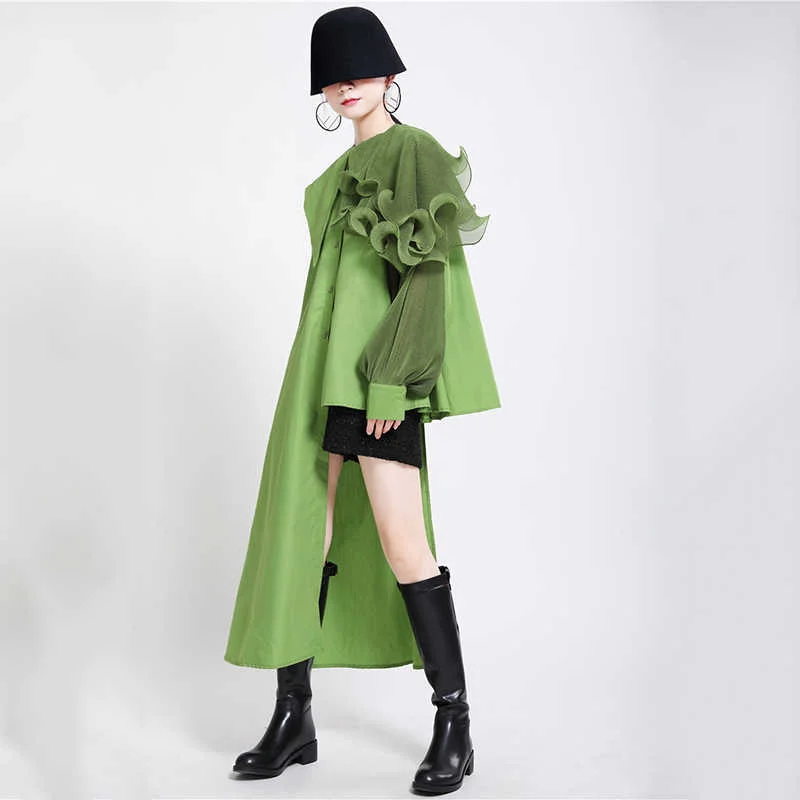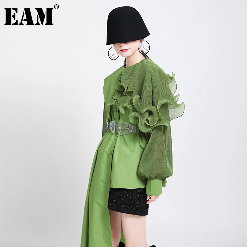 EAM женская зеленая Асимметричная блузка большого размера с оборками, новая свободная рубашка с отворотом и длинным рукавом, модная весенне-осенняя 2022 1DA218