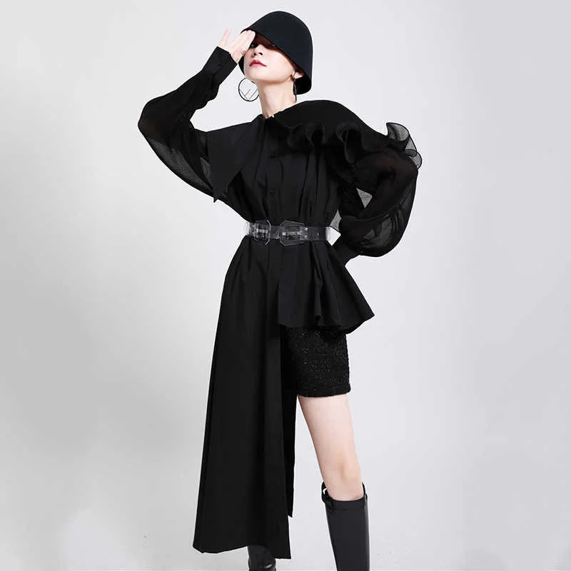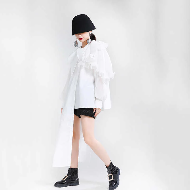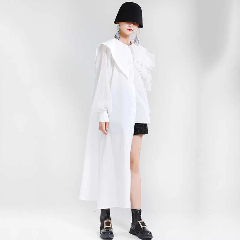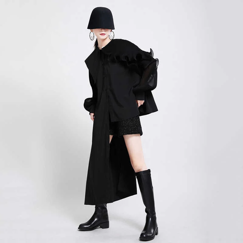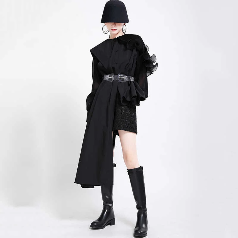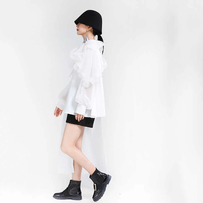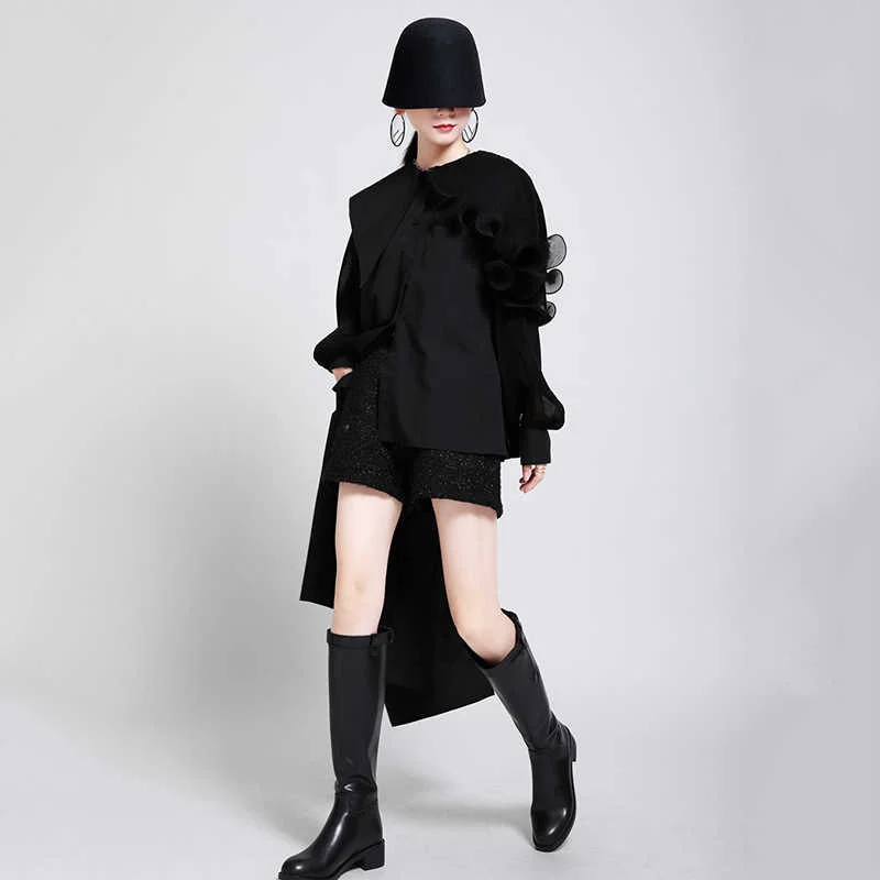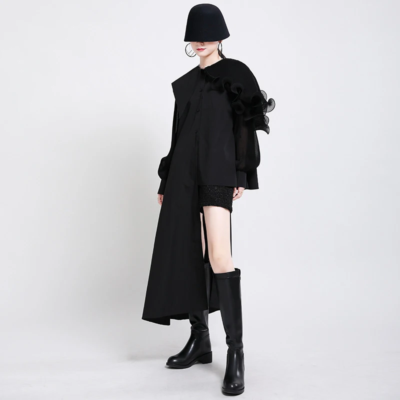 EAM женская зеленая Асимметричная блузка большого размера с оборками, новая свободная рубашка с отворотом и длинным рукавом, модная весенне-осенняя 2022 1DA218