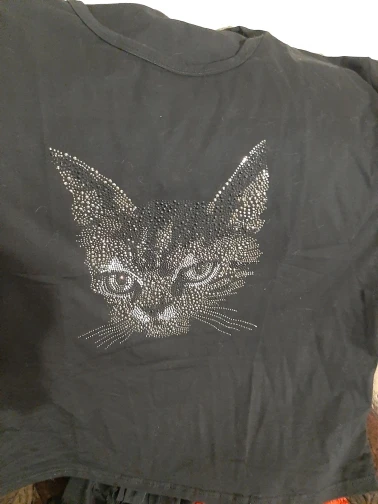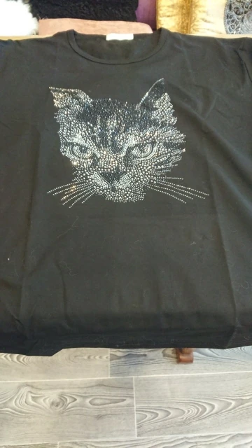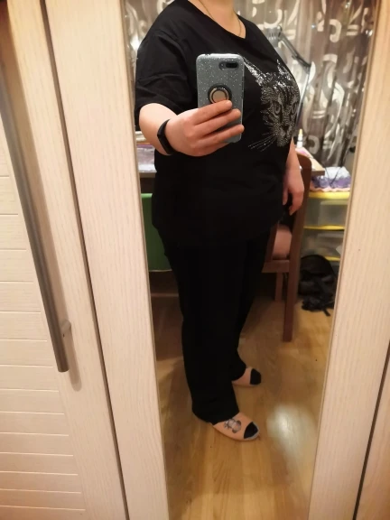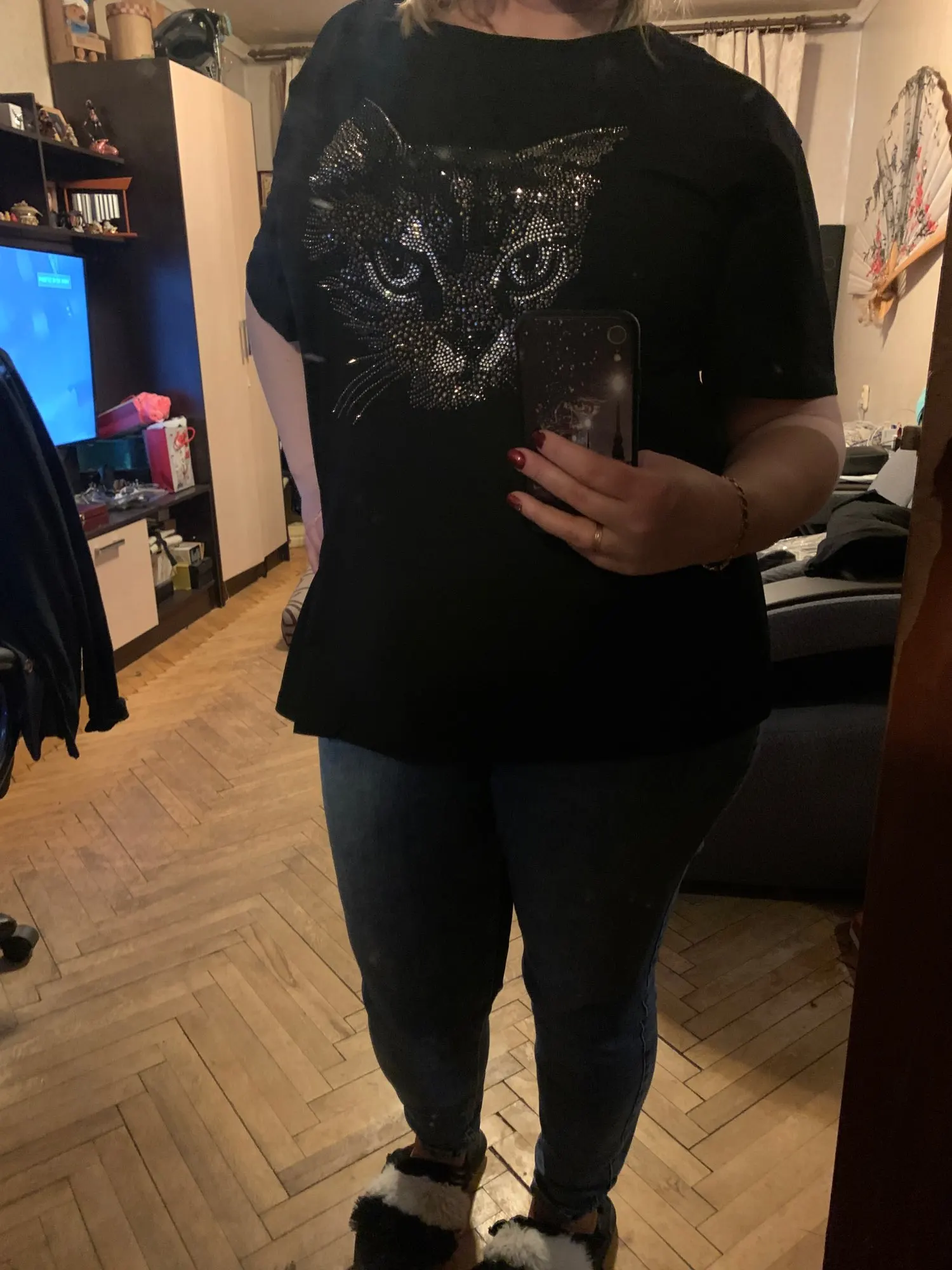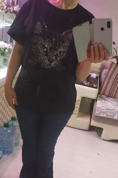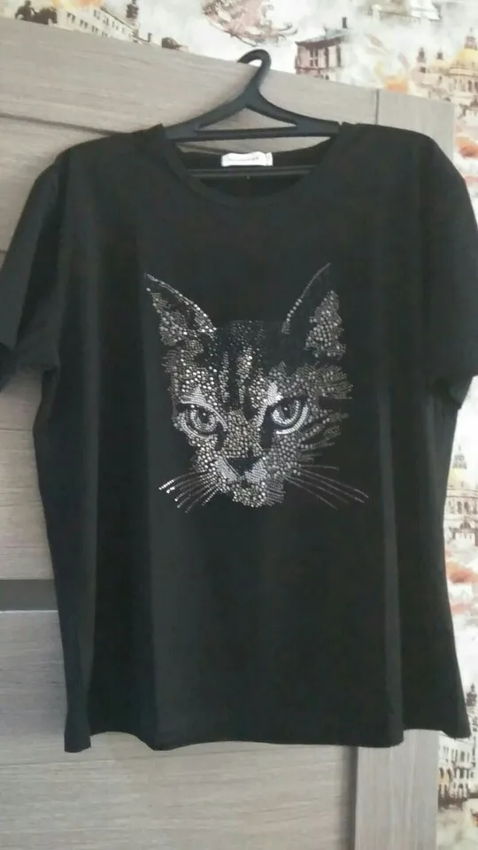 Хорошее качество, красивый рисунок стразами. Ткань хлопок, достаточно плотная. Футболка слегка приталена. Реальные размеры 3XL - ОГ 120, ОТ 112, по низу 122, длина - 68.