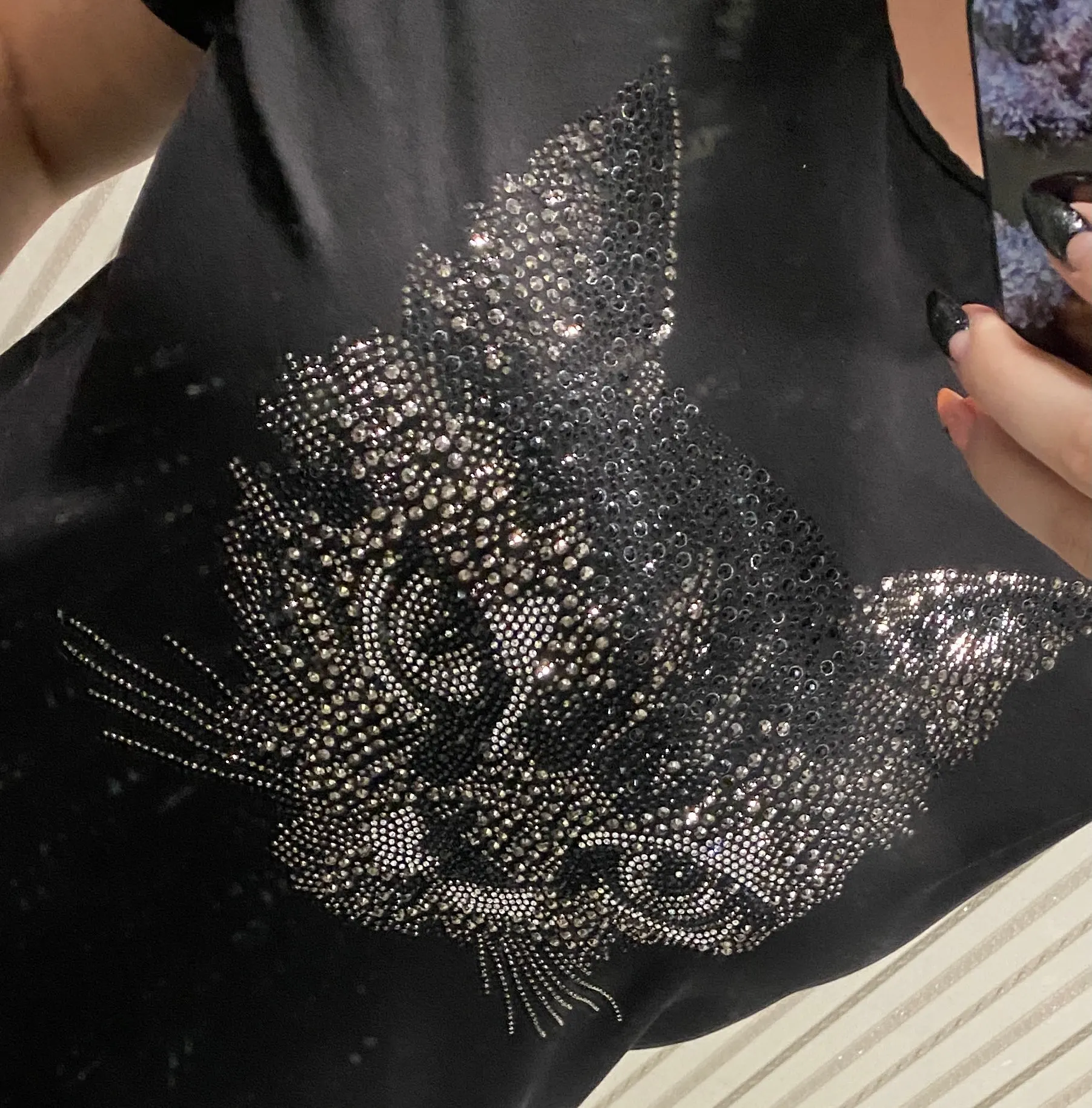 Обычная футболка, брала для дома, ещё не стирала незнаю как поведут себя стразы