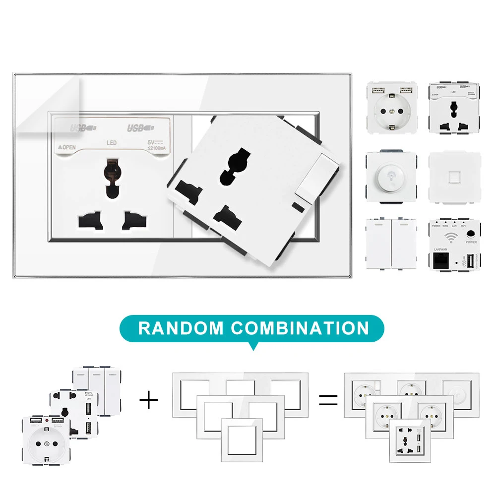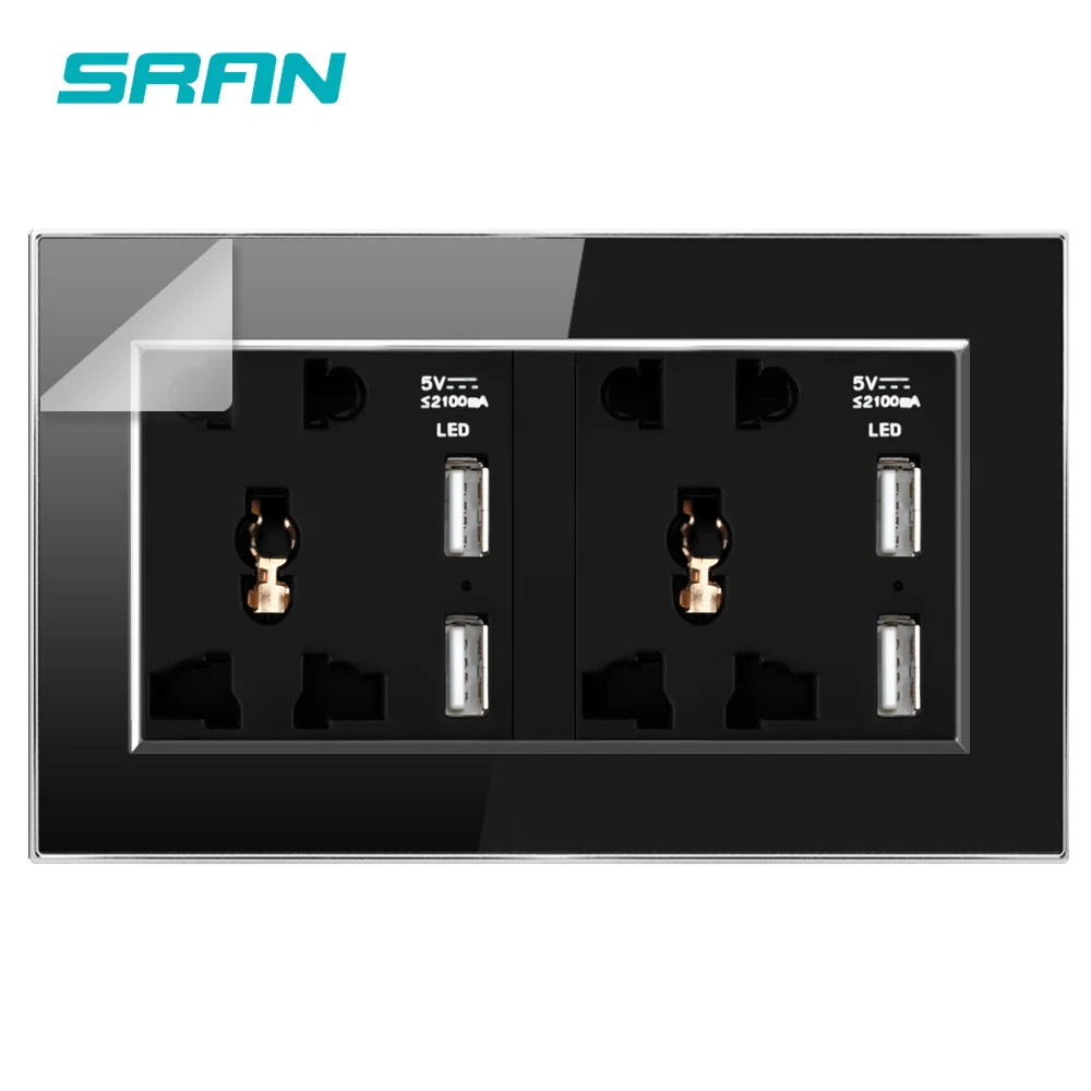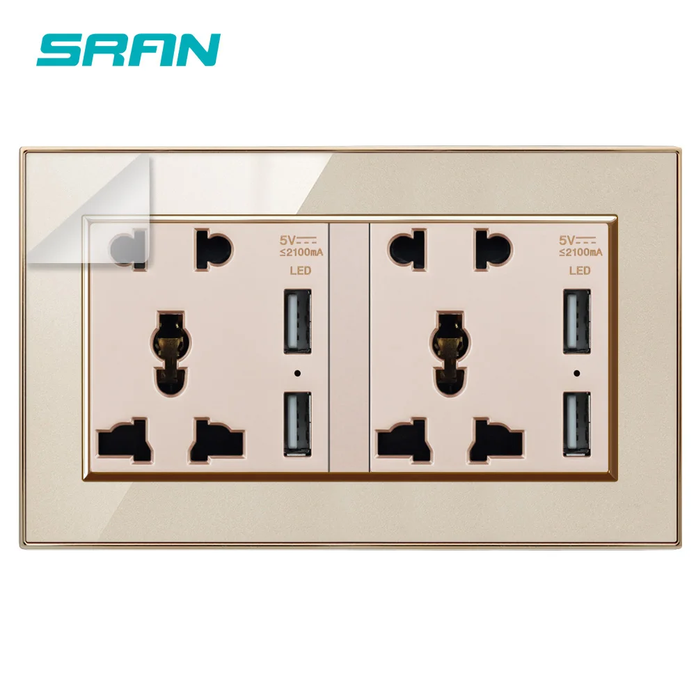 SRAN Универсальный 5Pin настенная розетка с USB,13A 250V белый/золотой с акриловой панелью с зеркальным покрытием серебро edge146mm * 86 мм разъем питания