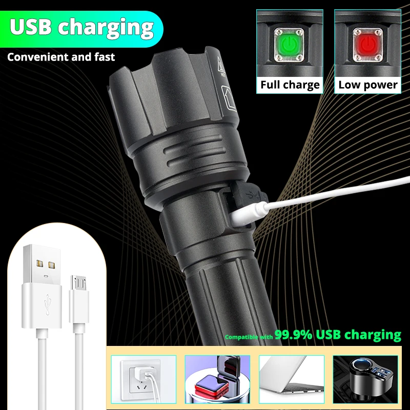 * Мощный светодиодный фонарик использует XLamp * XHP90.3 led ярче, чем xhp70. 2 * перезаряжаемый аккумулятор увеличивает время работы. * Отображение емкости аккумулятора. * Телескопический зум. * Micro usb для компьютера USB, Автомобильный USB, * USB-разъем для зарядки, зарядный фонарик. Изготовлен из алюминиевого сплава аэродинамического класса, надежный, жестко анодированный военный класс HAIII. * Водонепроницаемый в соответствии с IPX-6, водостойкий, можно использовать в дождливую погоду, но нельзя класть в воду * подходит для работы, охоты, скалолазания, рыбалки, кемпинга, активного отдыха и т. д. Ударопрочность до 2 метров.