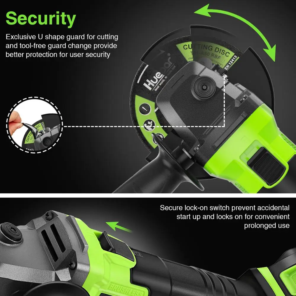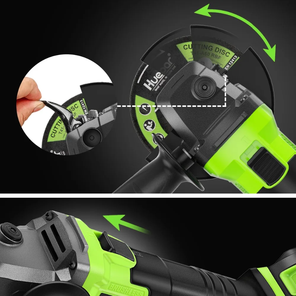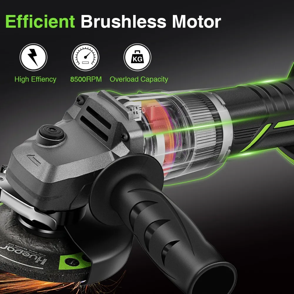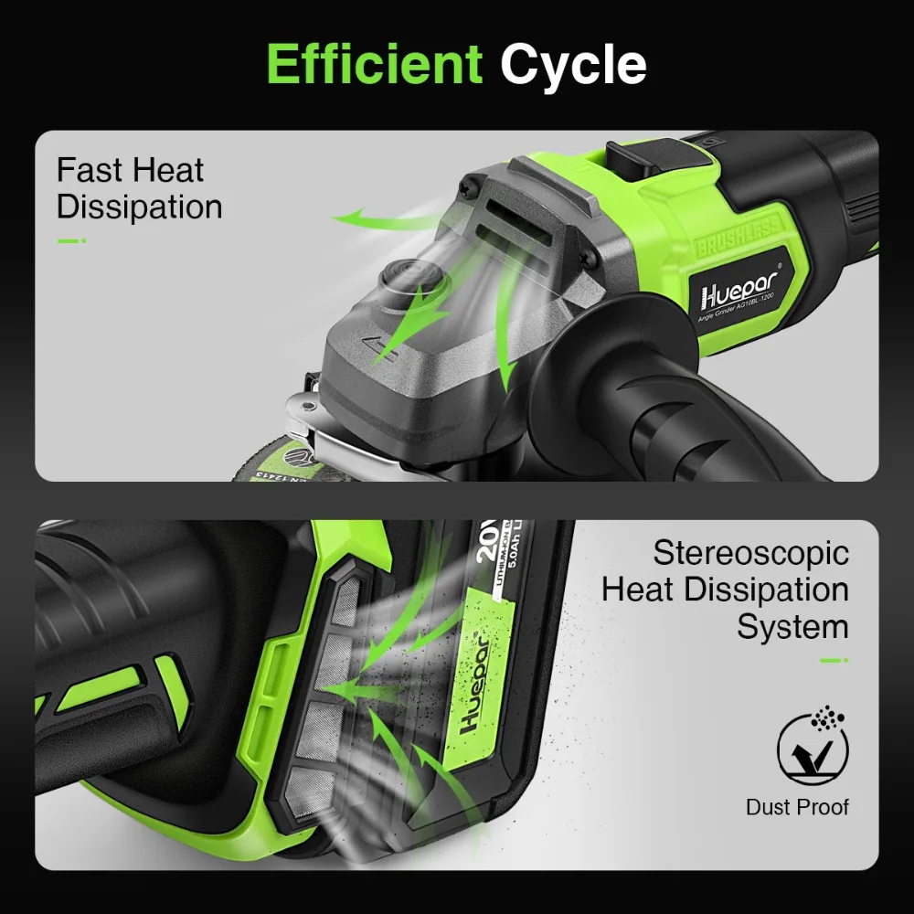 Угловая шлифовальная машина Huepar оснащена бесщеточным двигателем, который избавляет от угольных щеток, позволяя двигателю работать в кулере для более длительного срока службы инструмента, чем матовые модели.