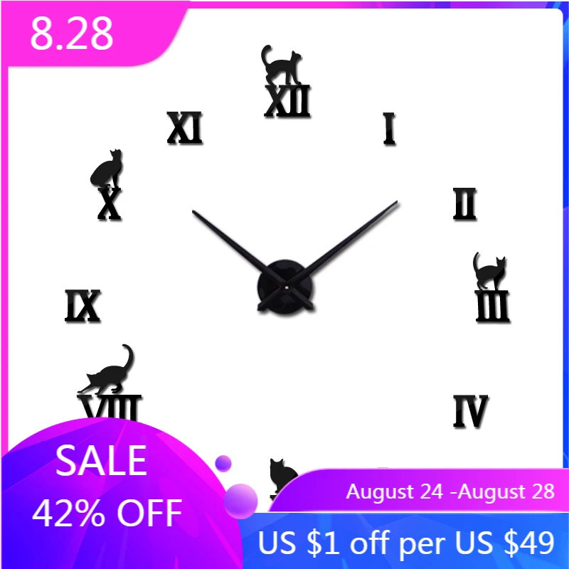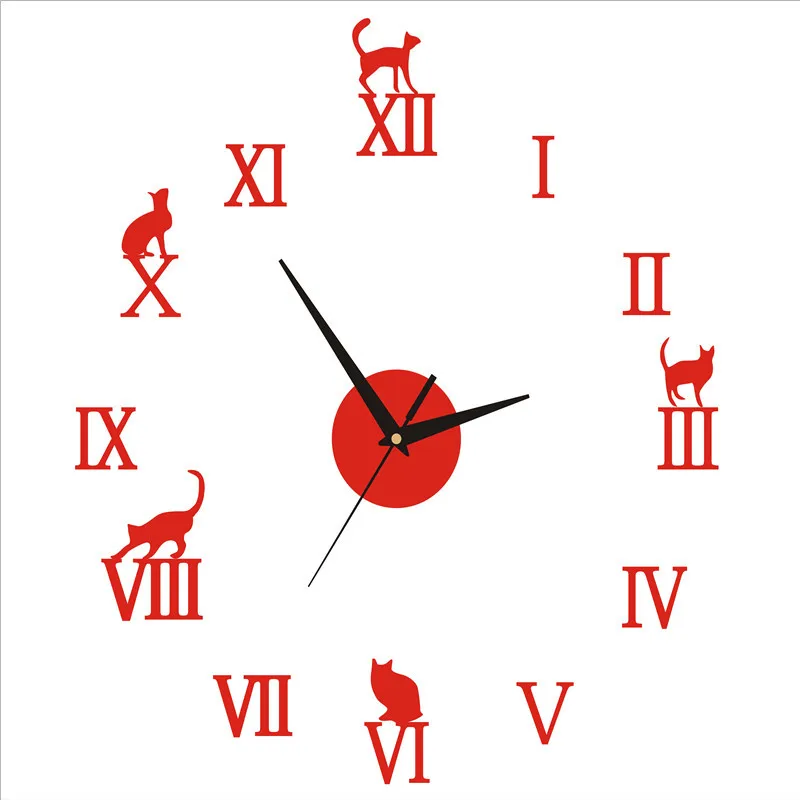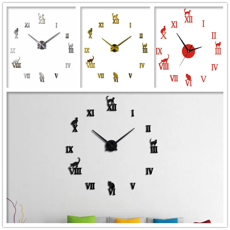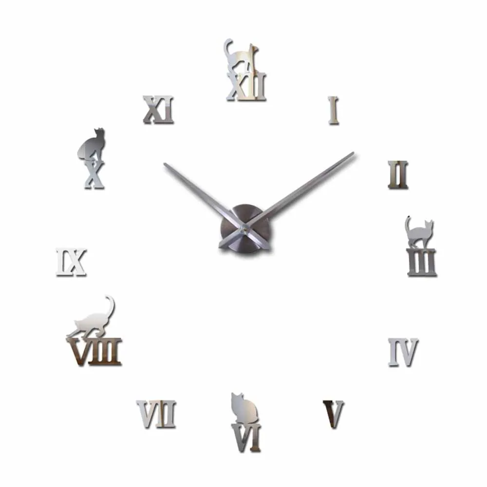 3D милый кот большие настенные часы Наклейка акриловая Бесшумная цифровая большая самоклеящаяся стена Современное украшение для дома