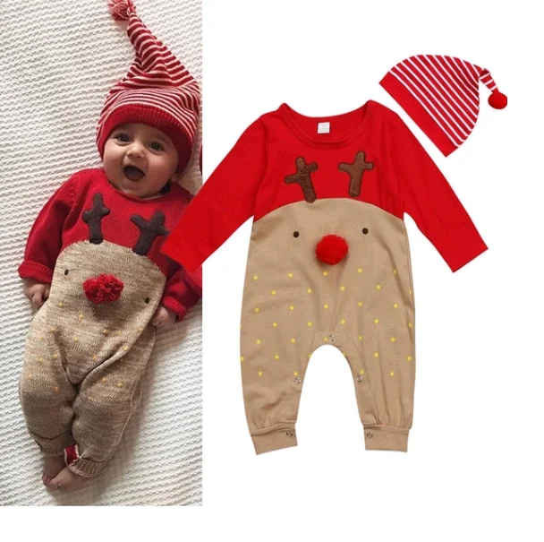 Комбинезон с рождественским оленем для новорожденных мальчиков и девочек Рождественский комбинезон с длинными рукавами с рисунком оленя и полосатой шапочкой для детей от 0 до 24 месяцев