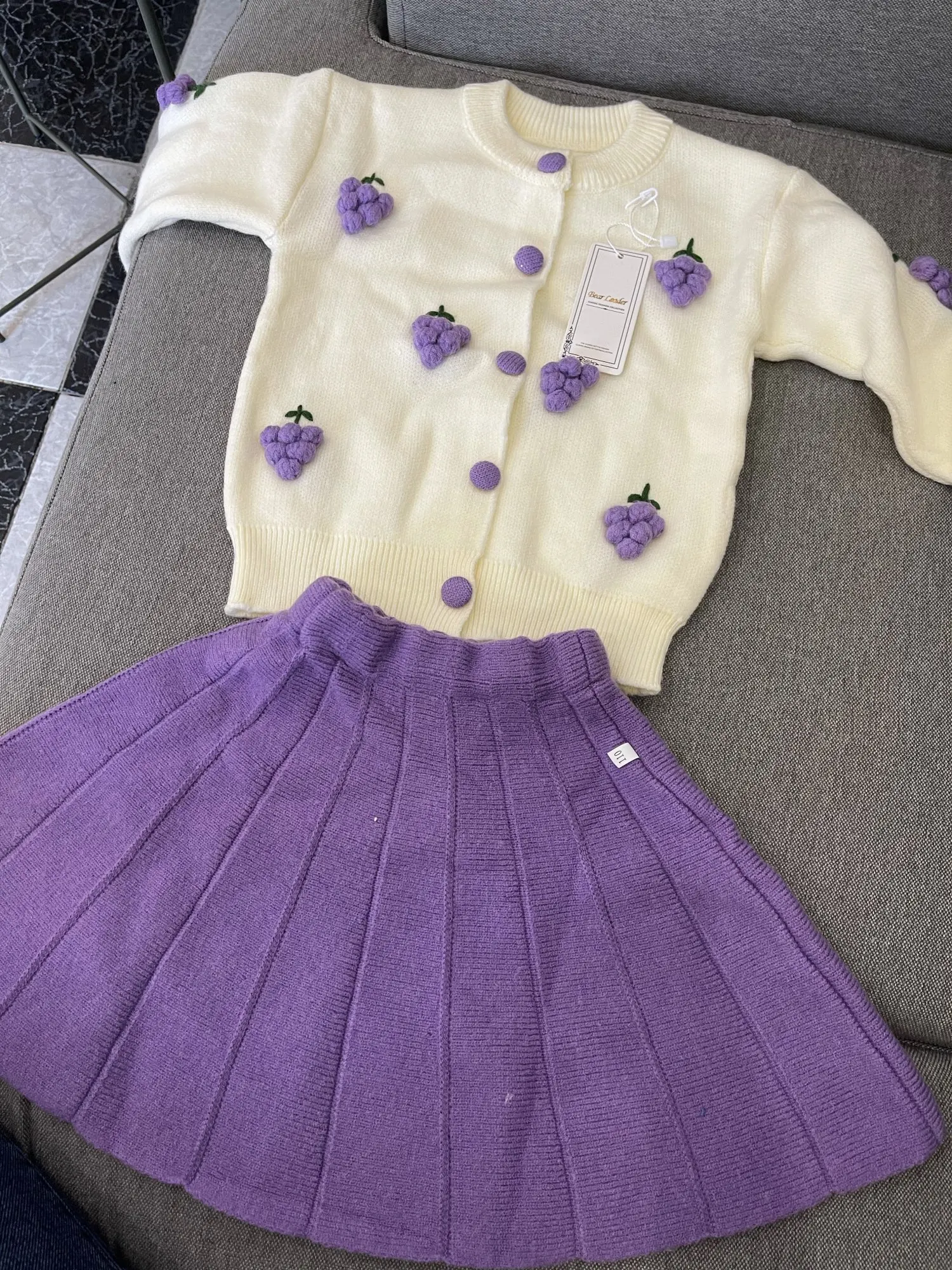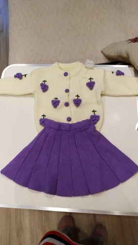 отличный костюм. на рост 86,вес 10.6 чуть свободно. кардиган рукав длинноват, юбочка ниже колена. кардиган не белый, бежевый. швы ровные и аккуратные. на внутренней стороне "ягоды" очень "волосатые" на ощупь очень мягкий, приятный к телу. очень быстрая доставка