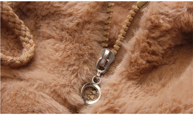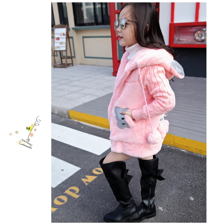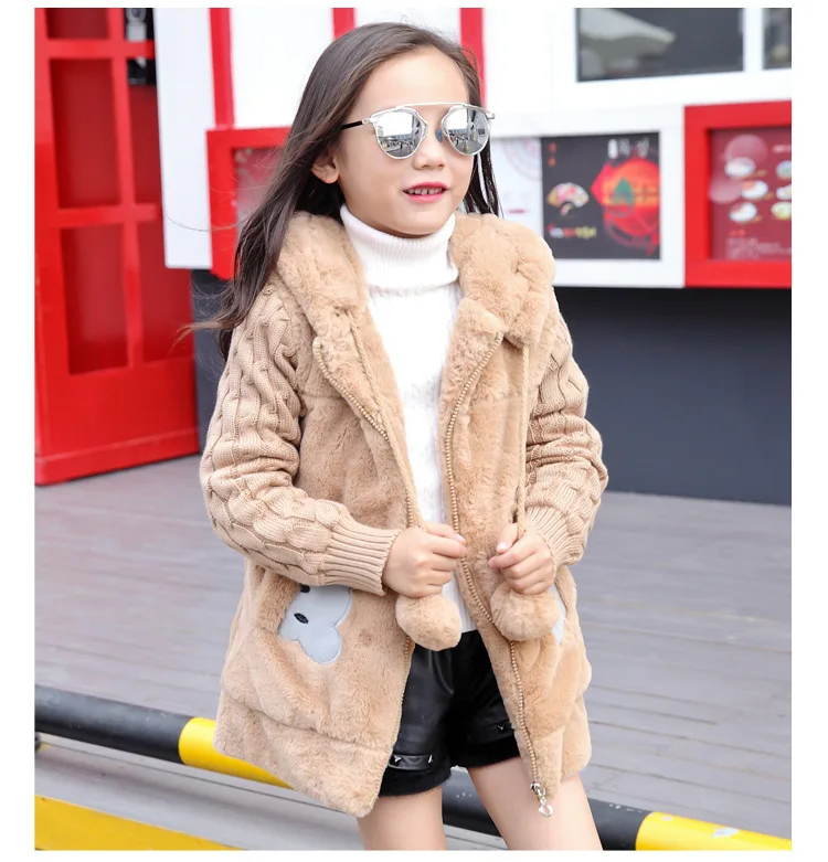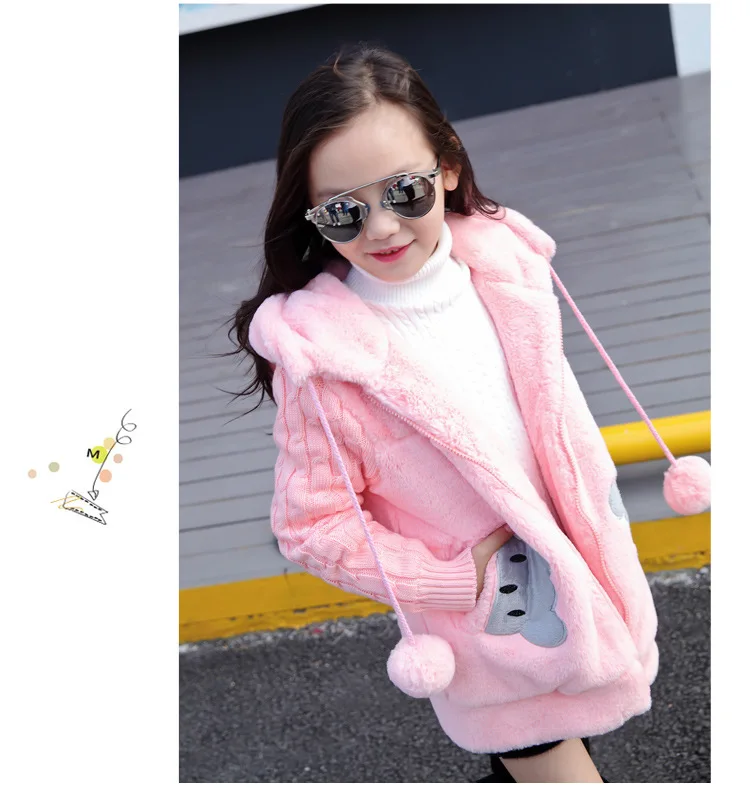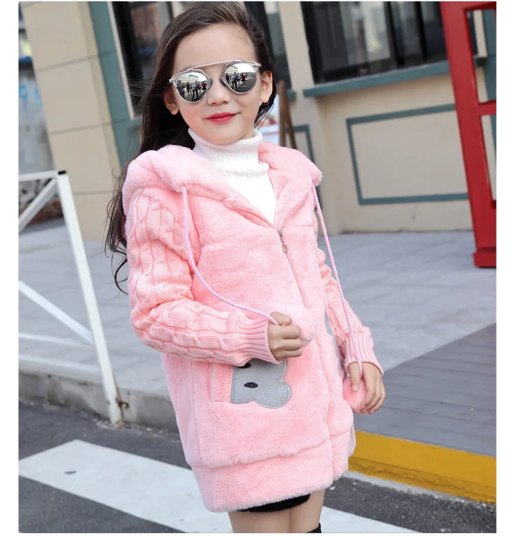 Зимняя плюшевая утепленная куртка для девочек средней длины с хлопковой подкладкой, милая мультяшная теплая плюшевая куртка с капюшоном и вязаными рукавами для девочек