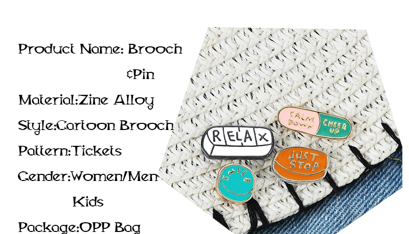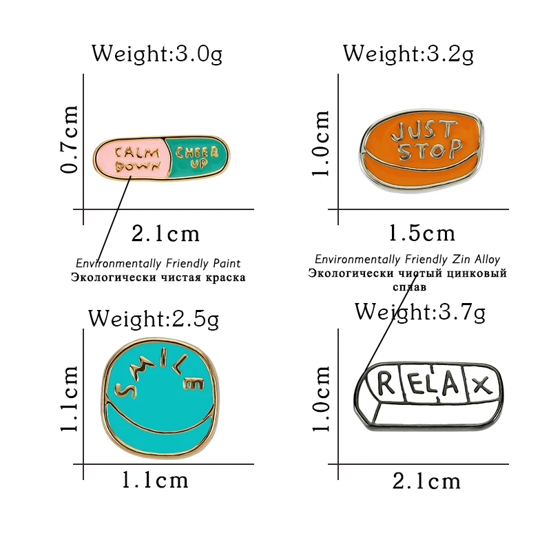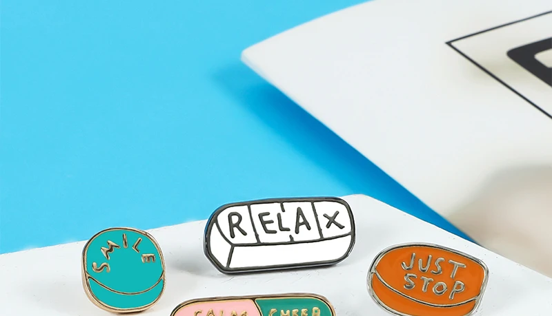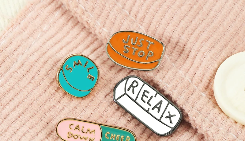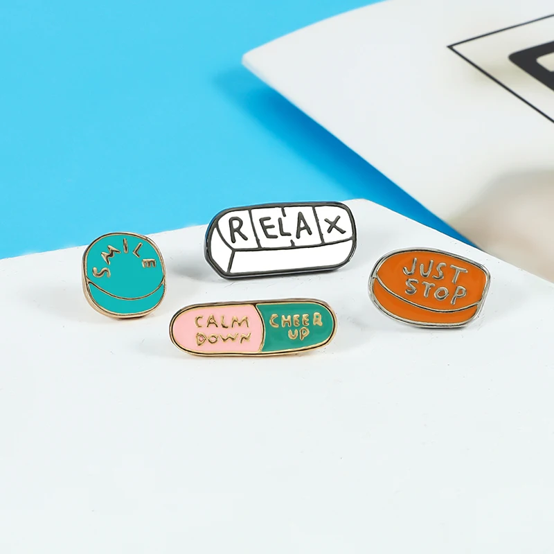 Забавные эмалевые заколки в виде мини-таблетки, креативные успокаивающие заколки, просто стоп, улыбка, расслабляющая Милая брошь в виде капсулы, джинсовые рубашки, булавки для лацканов, значки, ювелирные изделия