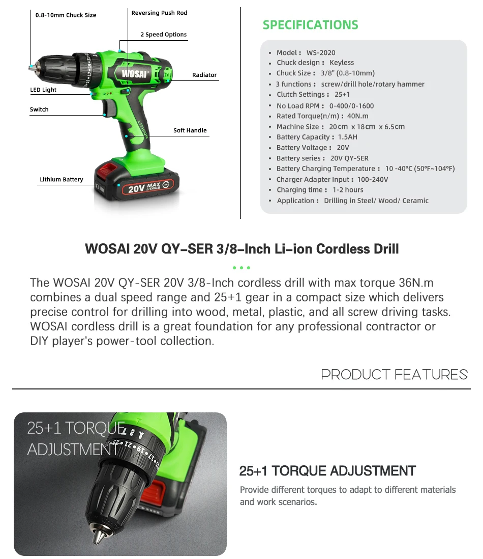 Дрель-шуруповерт WOSAI 3-в-1 QY, беспроводная, 20 в, с литиевым акк...