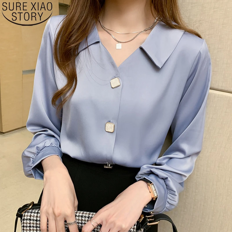 Блузка женская свободного покроя с длинным рукавом, Однотонная рубашка с V-образным вырезом, модная офисная блузка, одежда 2021, осень 11008