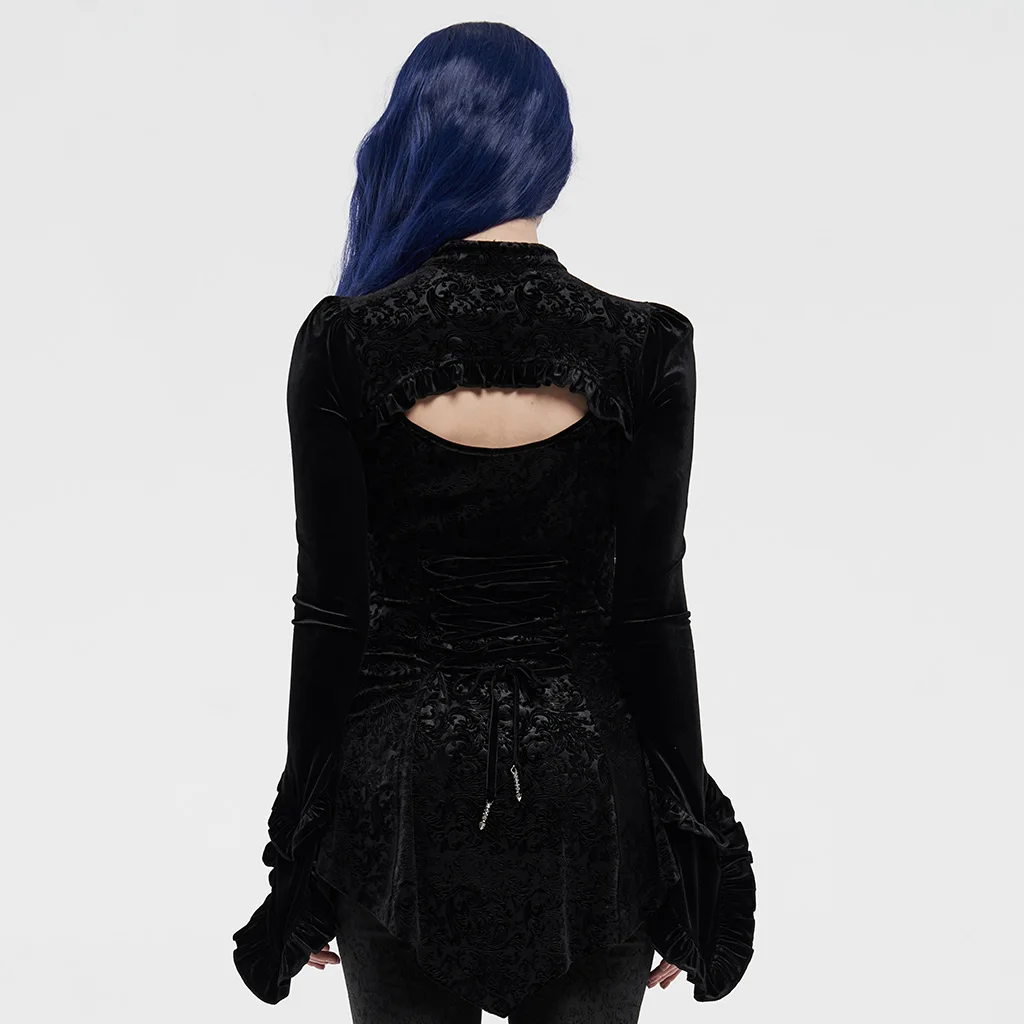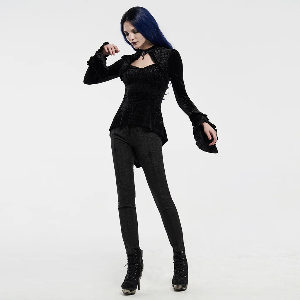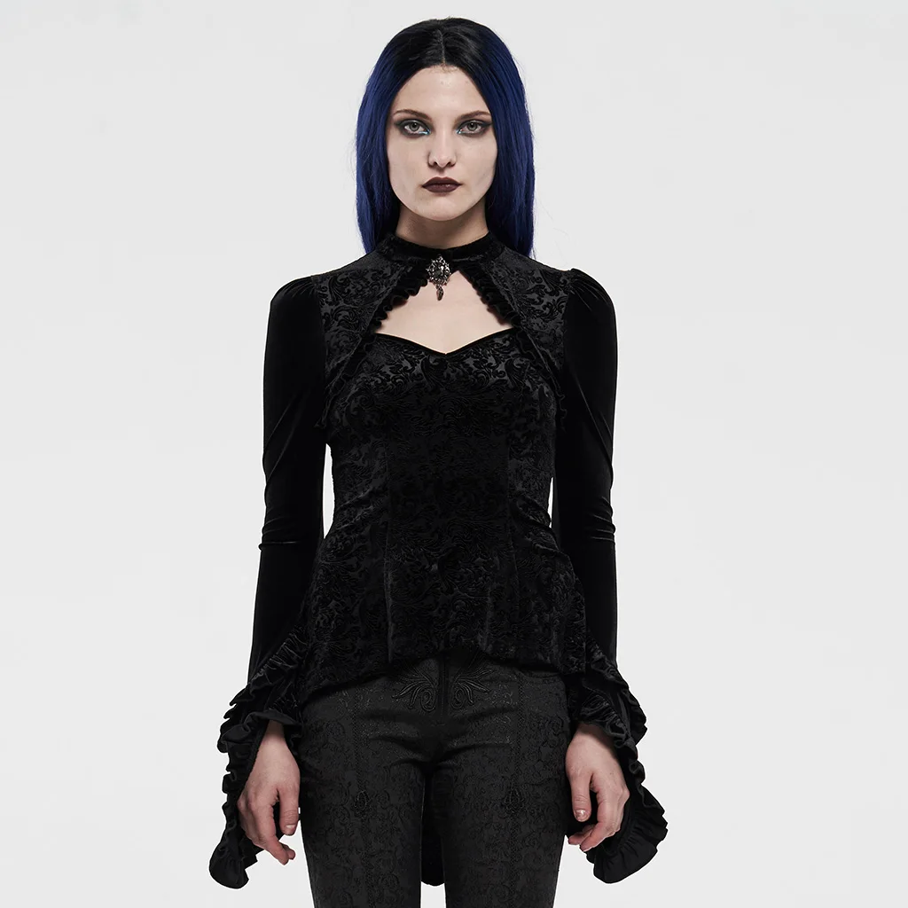 Женская футболка с длинным рукавом PUNKRAVE, Готическая бархатная футболка-бандо с асимметричным подолом и цветочным принтом для выступлений на сцене