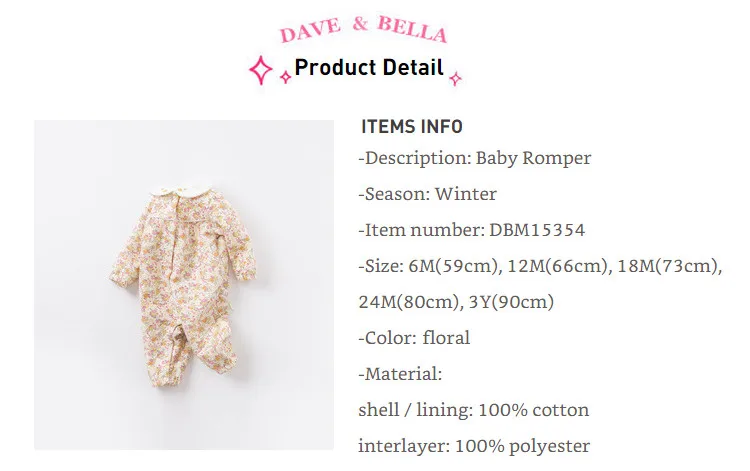 DBM15354 dave bellaмодные зимние комбинезоны с цветочным принтом для новорожденных девочек; Одежда для малышей; Детский комбинезон; 1 предмет